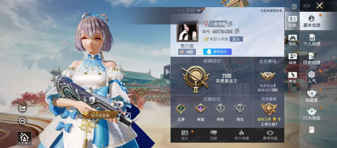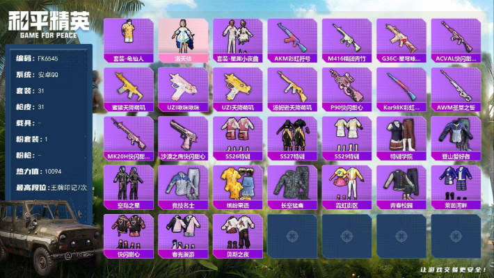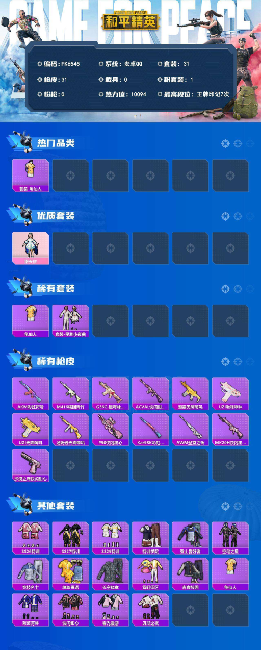 洛天依-7王牌印记-游戏等级56-女号】安卓 手Q-1粉装-0特效枪-0载具-0粉色飞行器-10094热力值-7王牌印记-31套装-31枪皮 【热门品类】:套装-龟仙人 【粉色套装】:角色-洛天依 【稀有套装】:套装-龟仙人,套装-星渊小夜曲 【稀有枪皮】:AKM-彩虹符号,M416-糯团青竹,G36C-星穹咏叹调,AC-VAL-快闪甜心,蜜獾-天降萌叽,UZI-啾咪啾咪,UZ