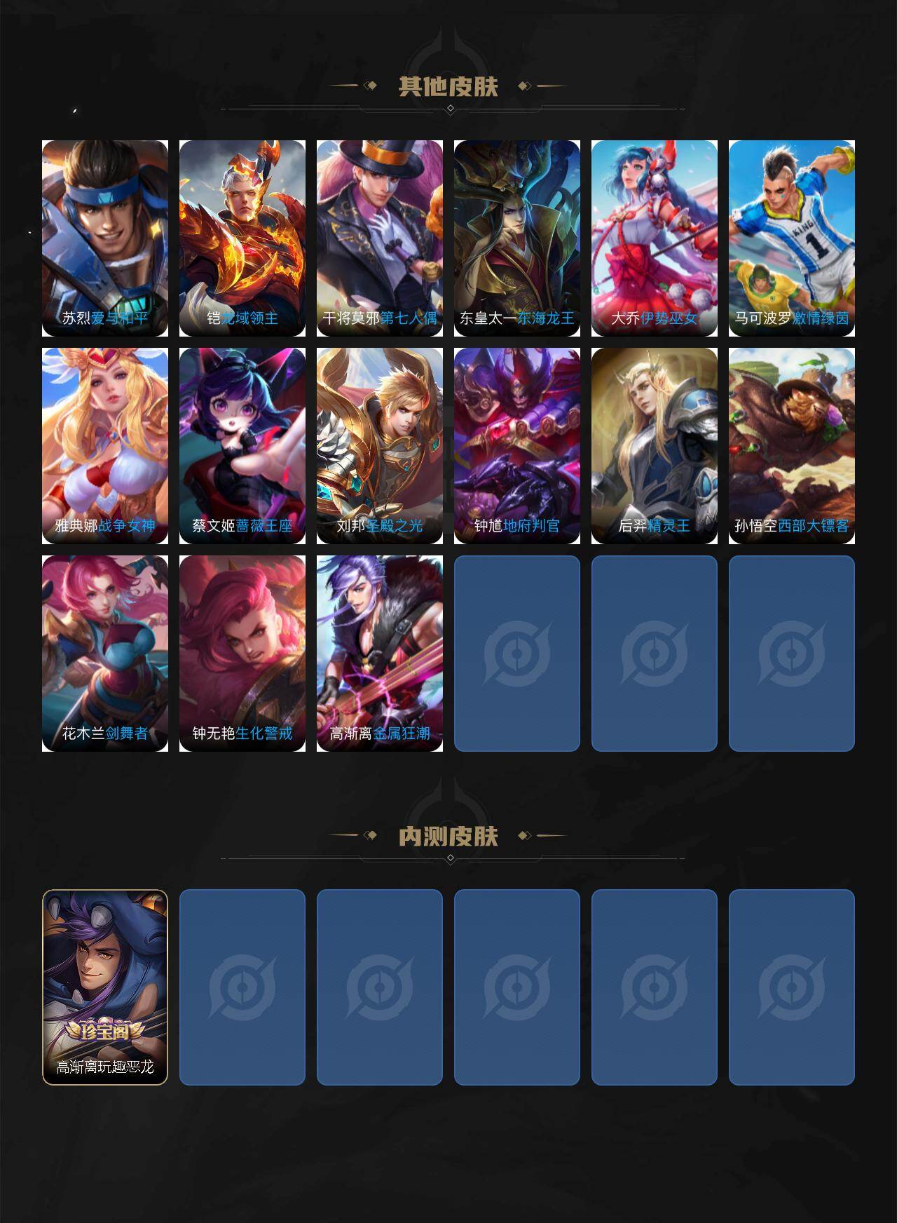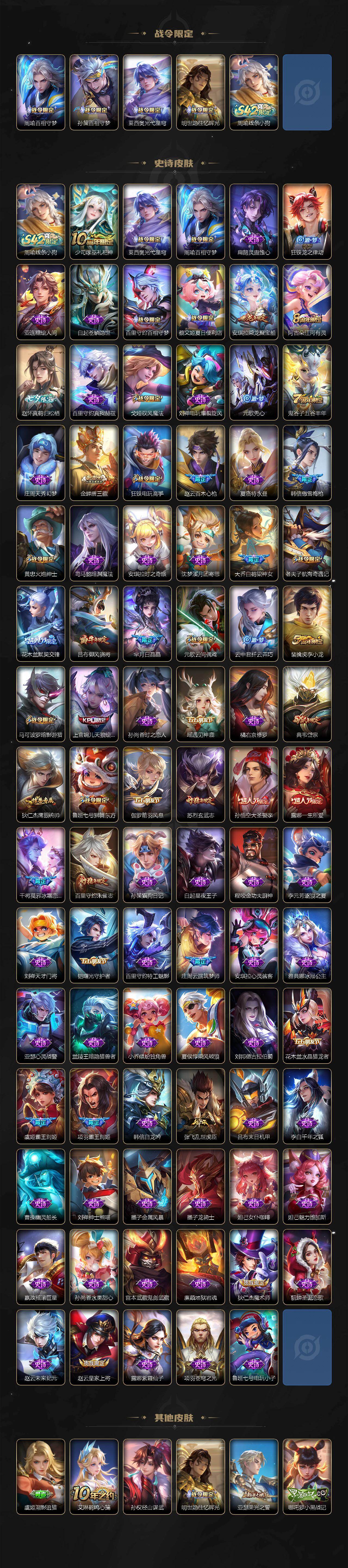 【传说皮肤】:司空震愿照山河定,女娲愿照千秋盛,妲己愿照众生和,澜愿照九州拓,虞姬愿照岁时盈,桑启鸣野蒿,云缨鹤归松栖,东皇太一灼幽烈阳,夏洛特浮生妄,吕布怒海麟威,李白诗剑行,不知火舞绯月行,百里守