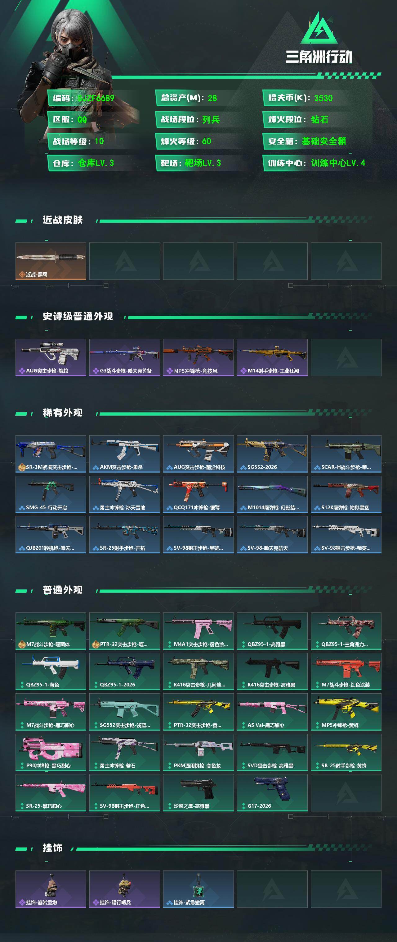 总资产(M):28M/哈夫币(K):3530K/全面战场等级:10_段位:列兵/烽火地带等级:60_段位:钻石/近战-黑鹰/