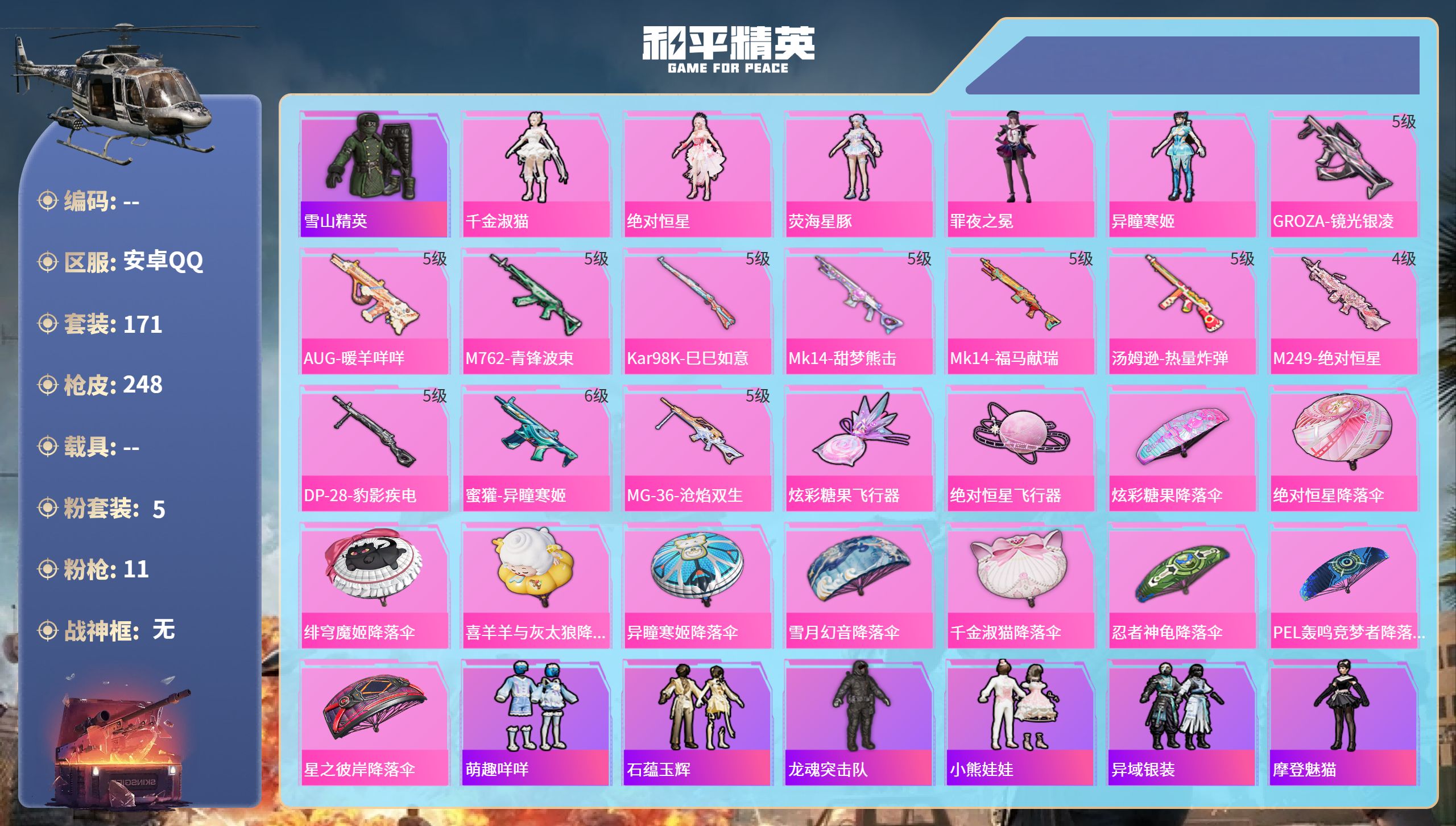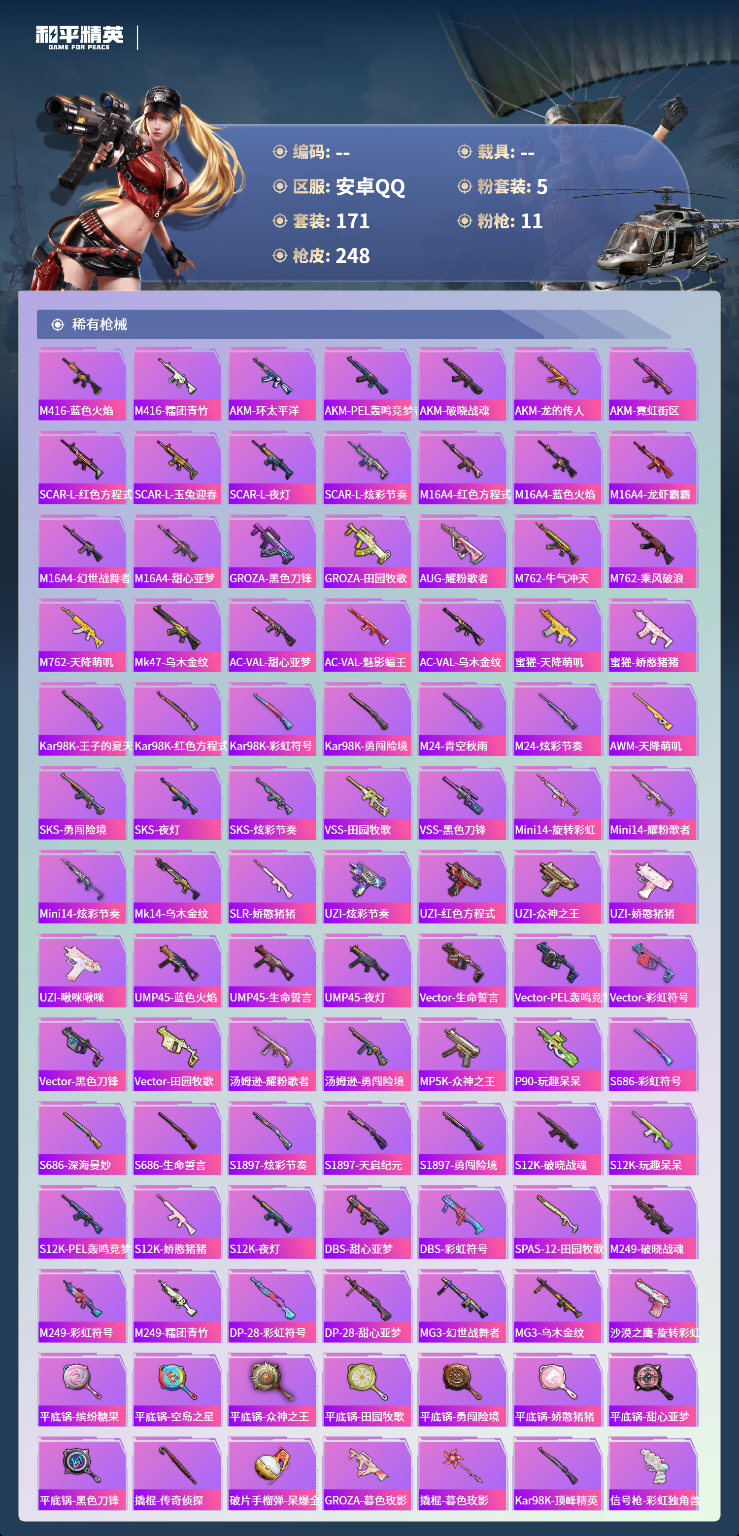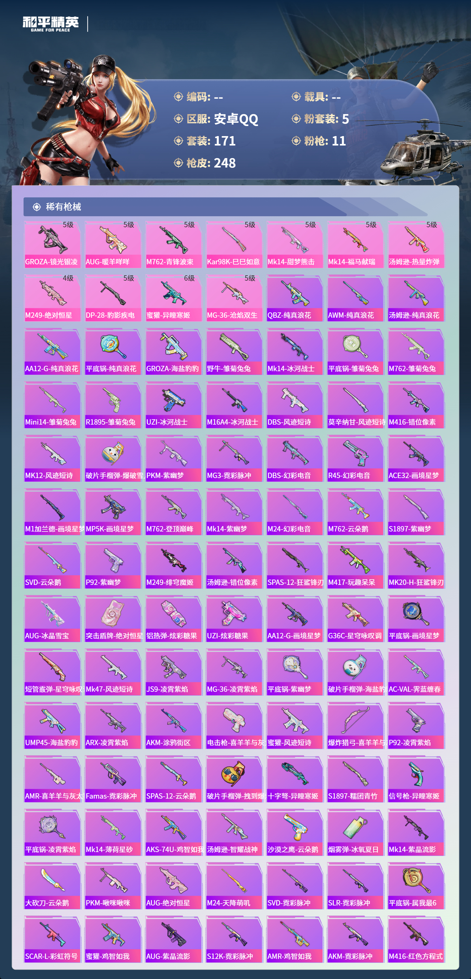 hs56198安卓手Q-7王牌印记-5粉装-11特效枪-75920热力值-171套装-248枪皮-1卓越印记-1传奇印记