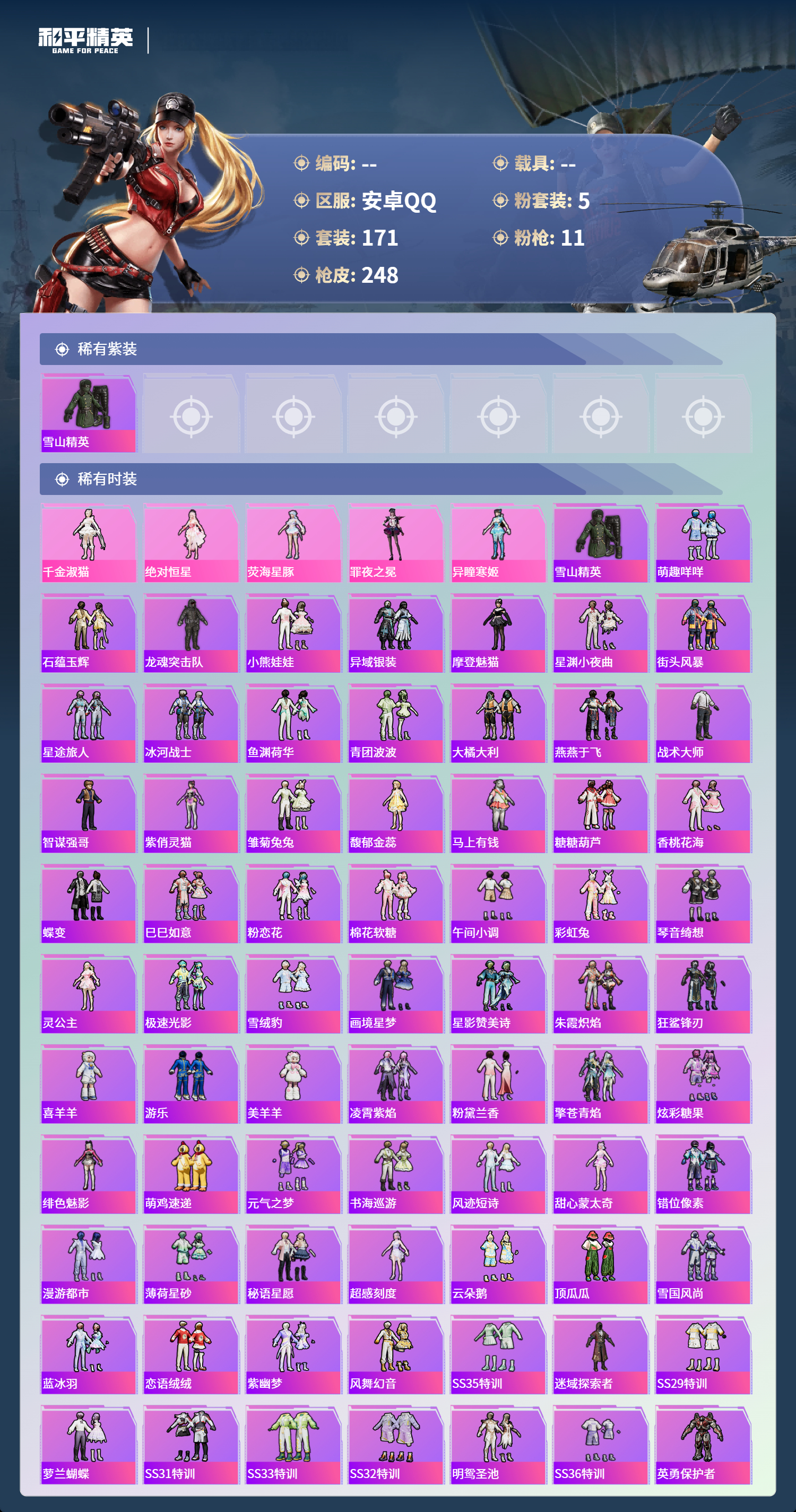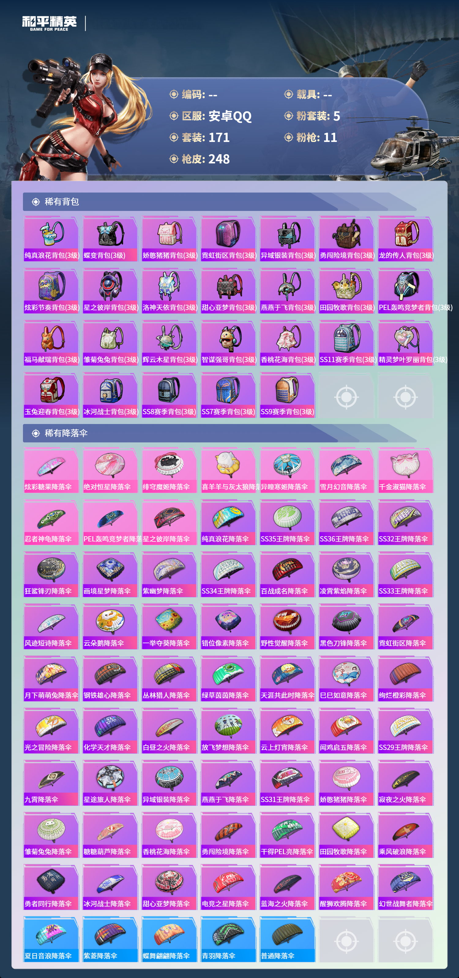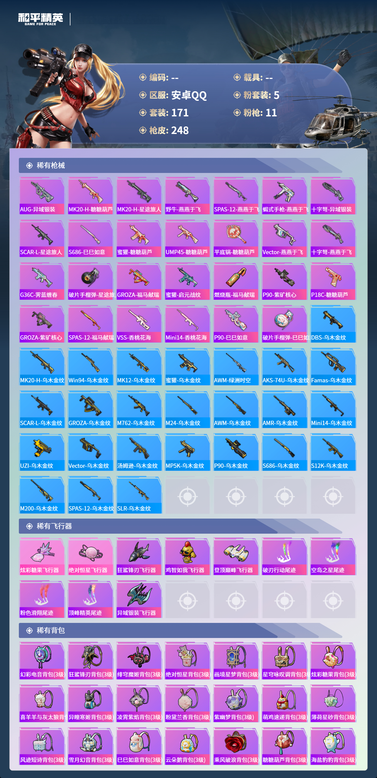 hs56198安卓手Q-7王牌印记-5粉装-11特效枪-75920热力值-171套装-248枪皮-1卓越印记-1传奇印记