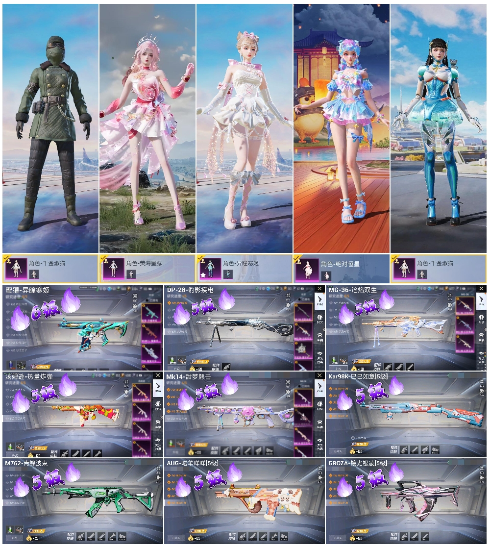 【11特效枪】汤姆逊-热量炸弹/5级,M762-青锋波束/5级,Mk14-福马献瑞/5级,Kar98K-巳巳如意/5级,蜜獾-异瞳寒姬/6级,GROZA-镜光银凌/5级,M249-绝对恒星/4级,Mk14-甜梦熊击/5级,MG-36-沧焰双生/5级,AUG-暖羊咩咩/5级,DP-28-豹