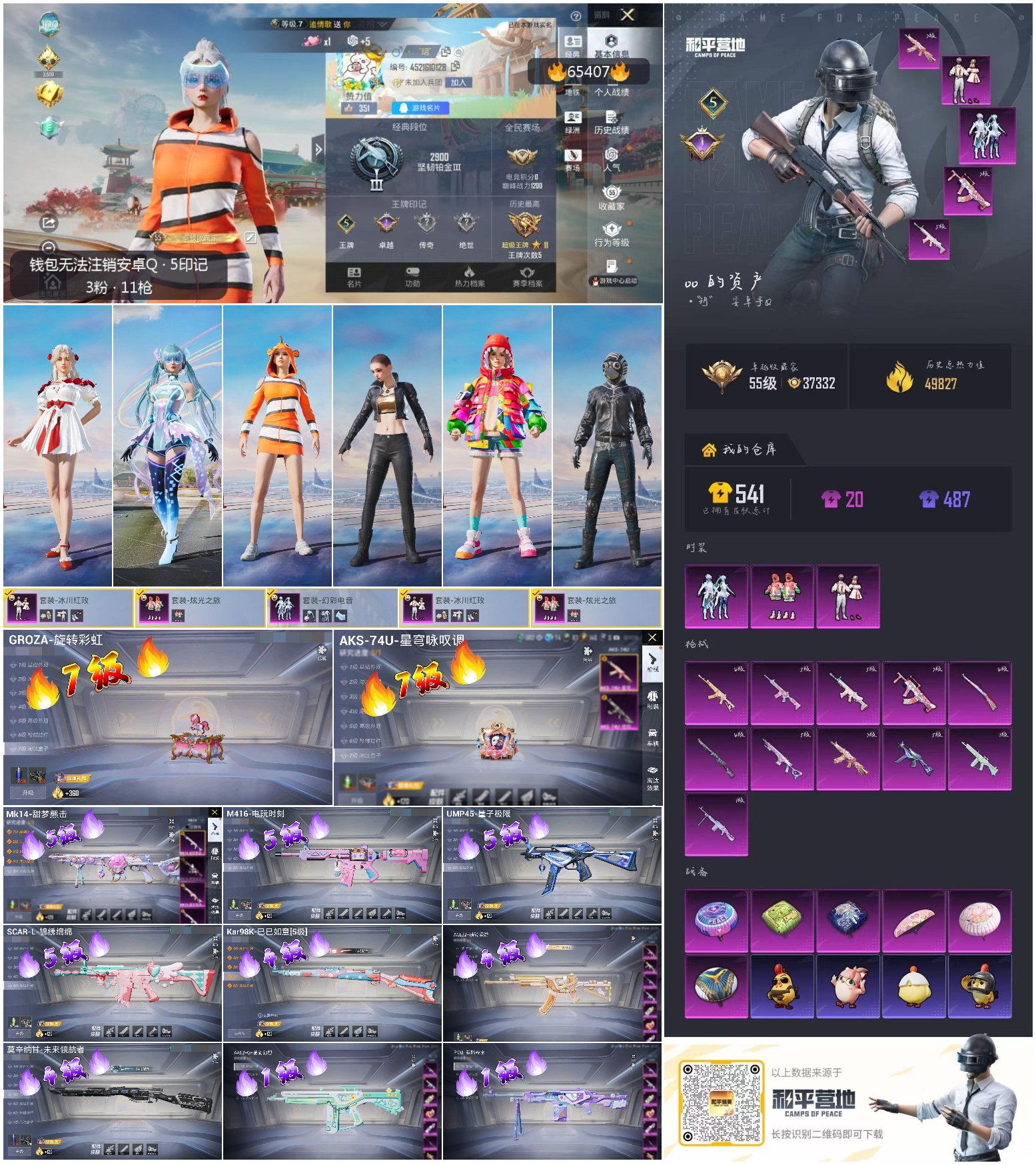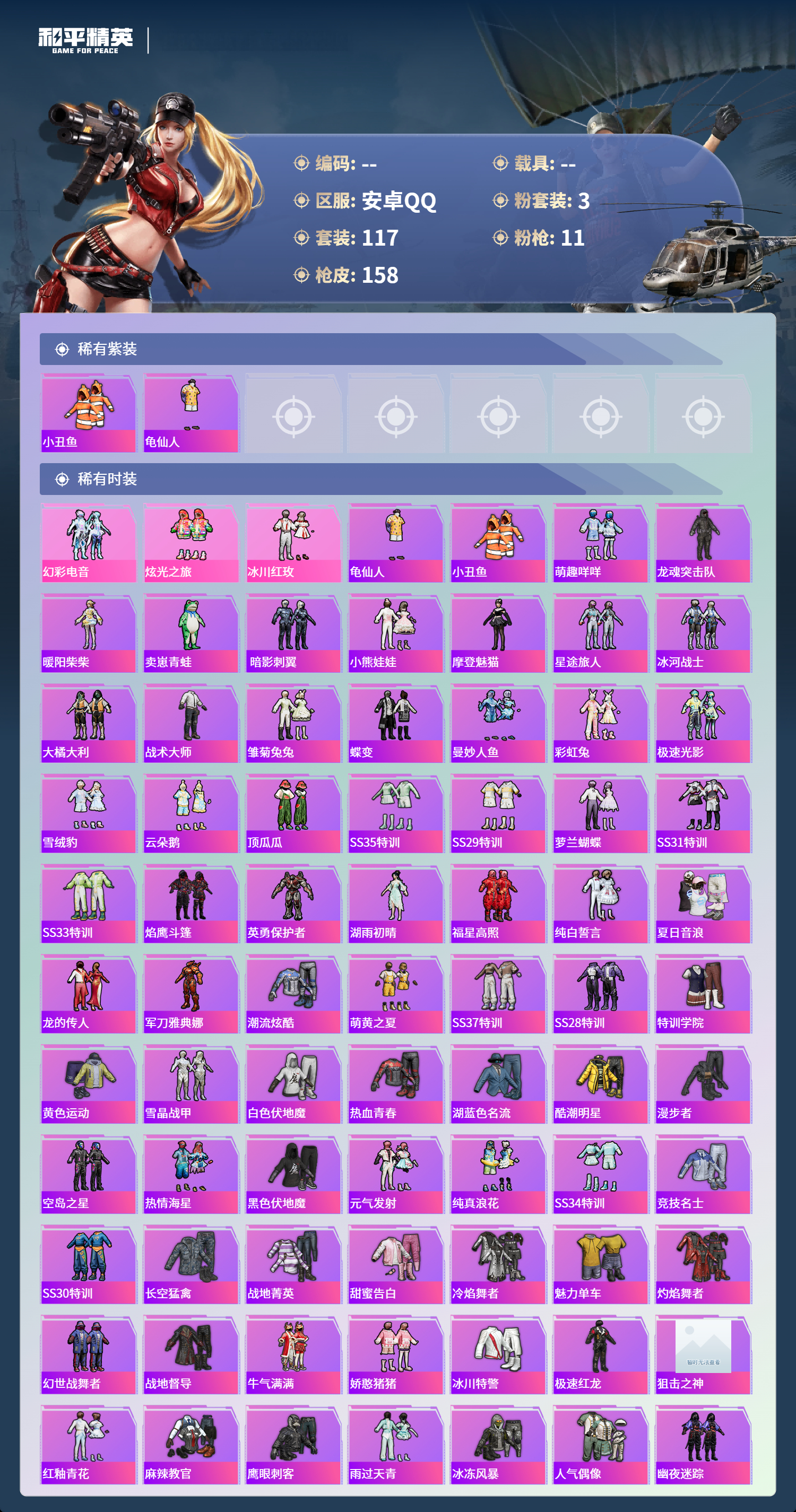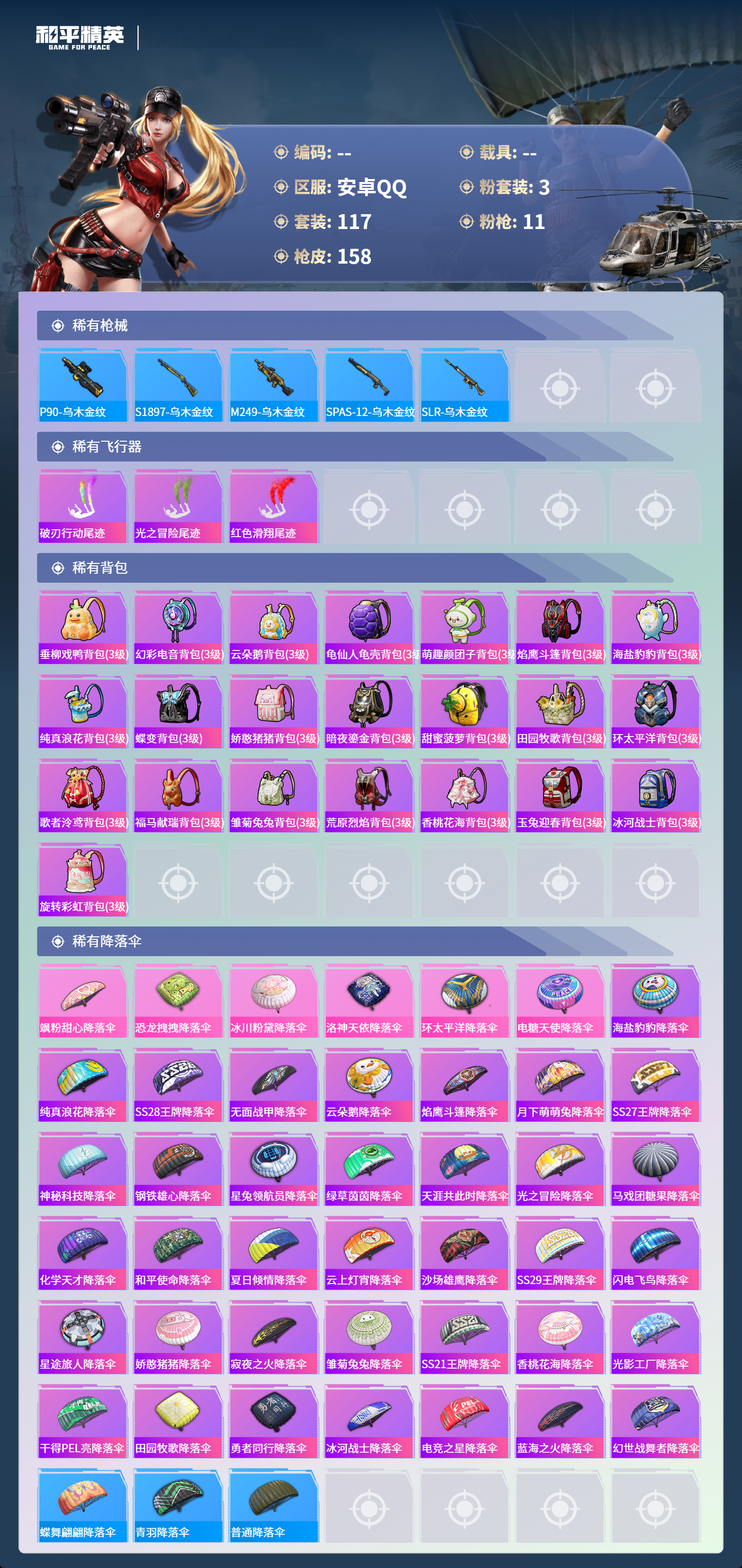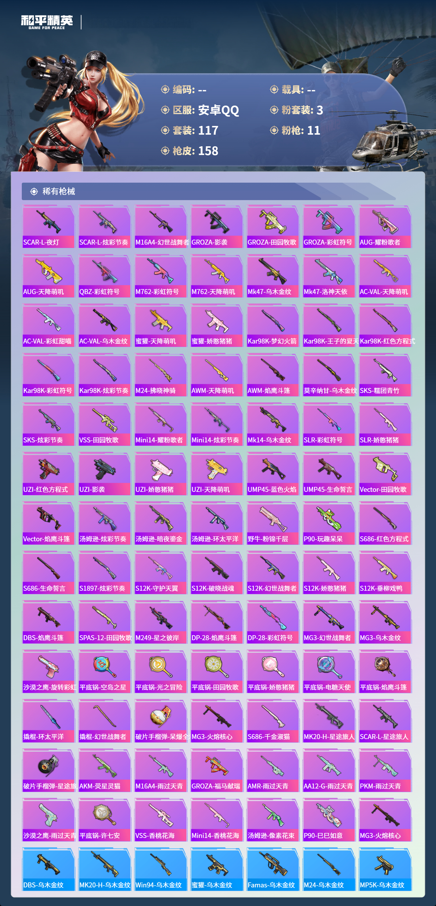 hs65407安卓手Q-5王牌印记-3粉装-11特效枪-50007热力值-117套装-158枪皮-1卓越印记