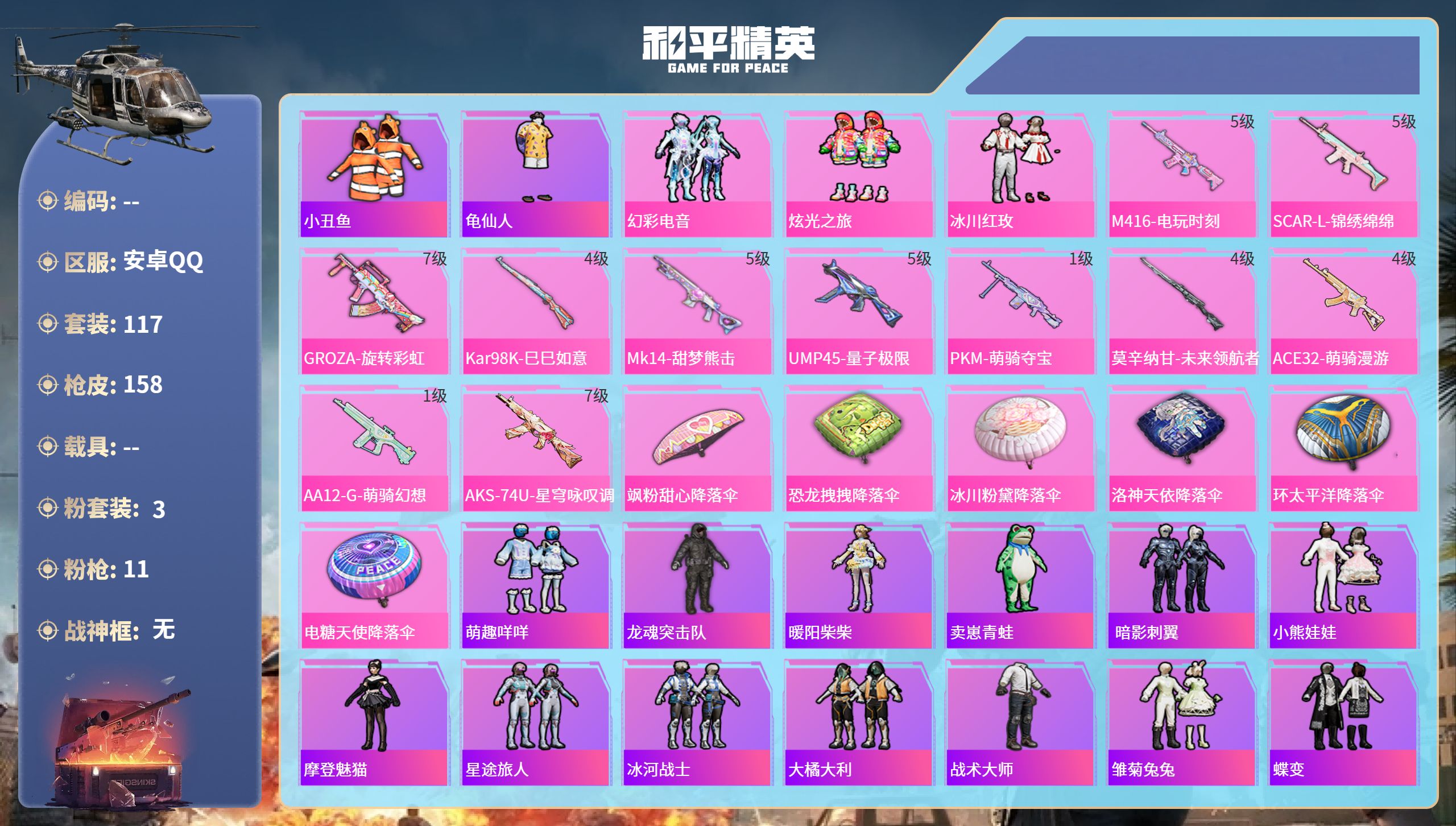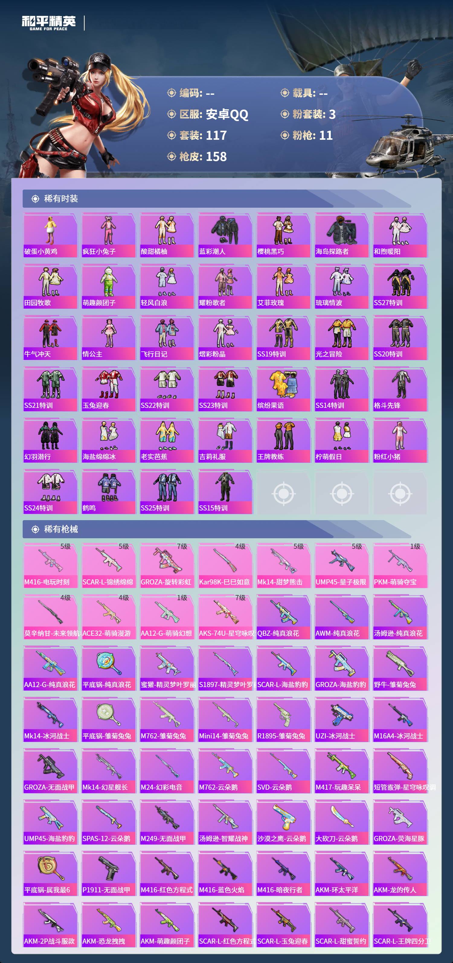 【11特效枪】Kar98K-巳巳如意/4级,莫辛纳甘-未来领航者/4级,M416-电玩时刻/5级,AA12-G-萌骑幻想/1级,UMP45-量子极限/5级,GROZA-旋转彩虹/7级,AKS-74U-星穹咏叹调/7级,PKM-萌骑夺宝/1级,Mk14-甜梦熊击/5级,SCAR-L-锦绣绵绵/5级,ACE32-萌骑漫游/4级