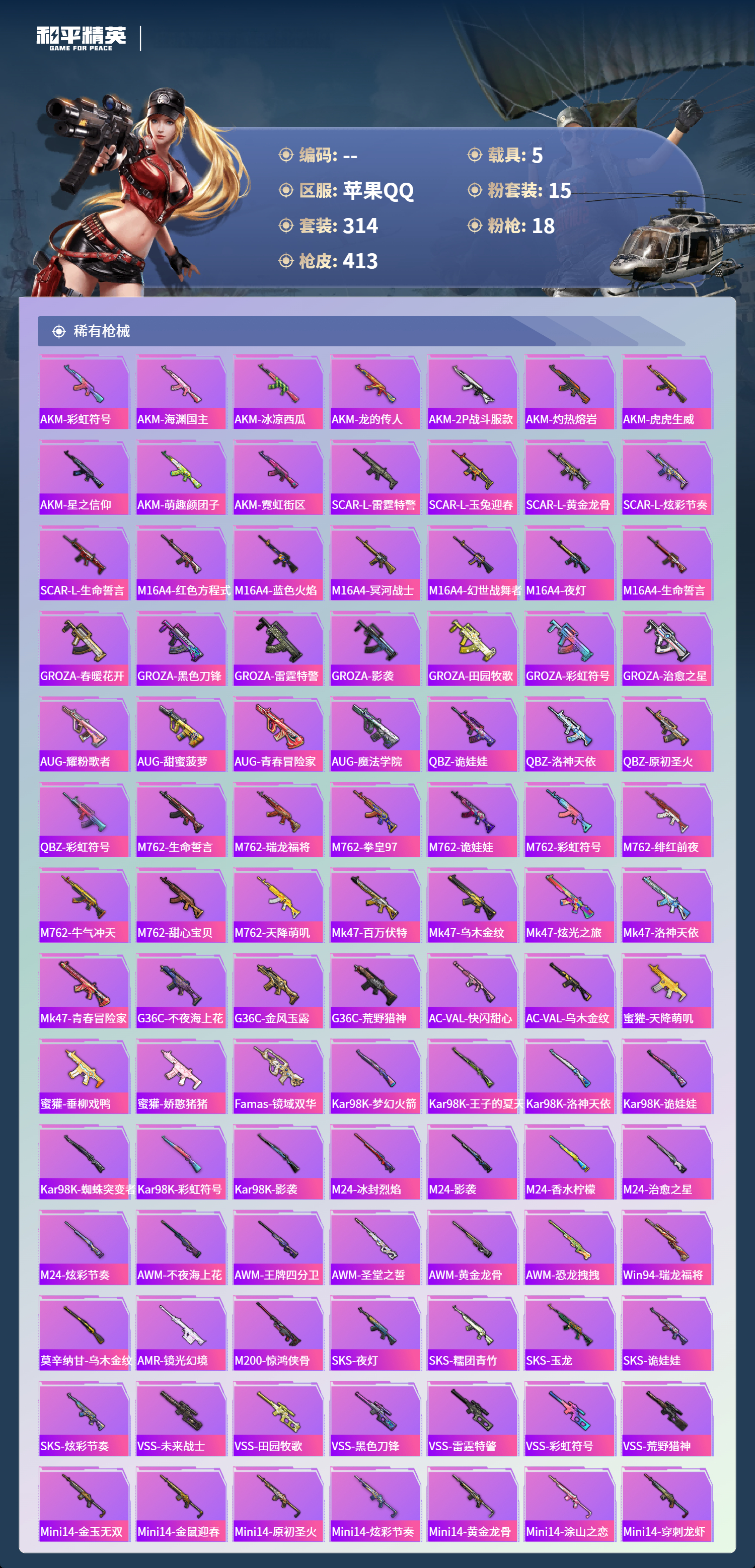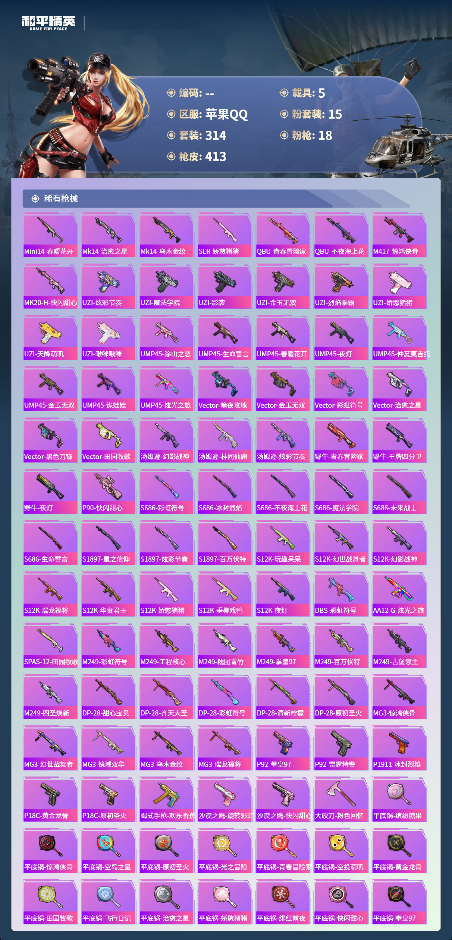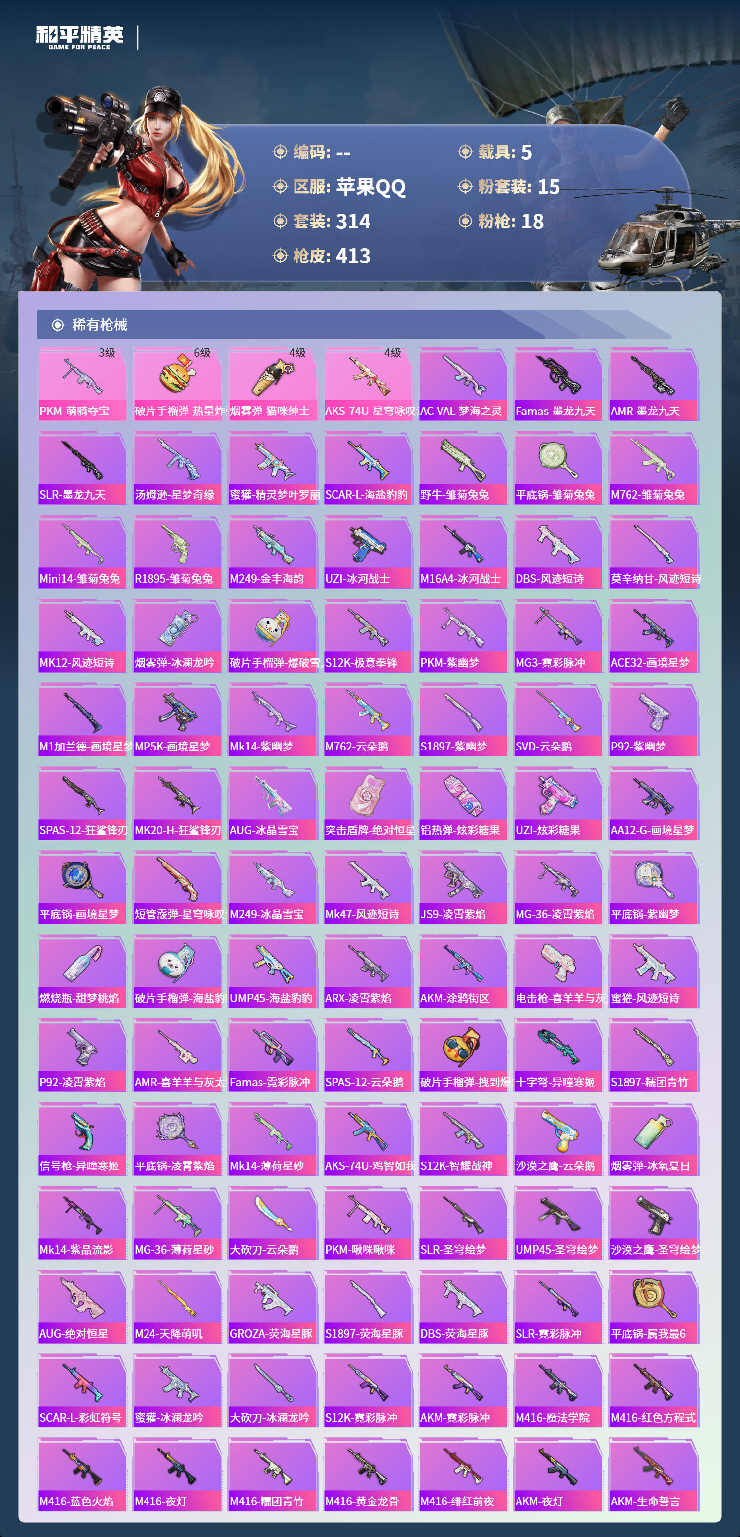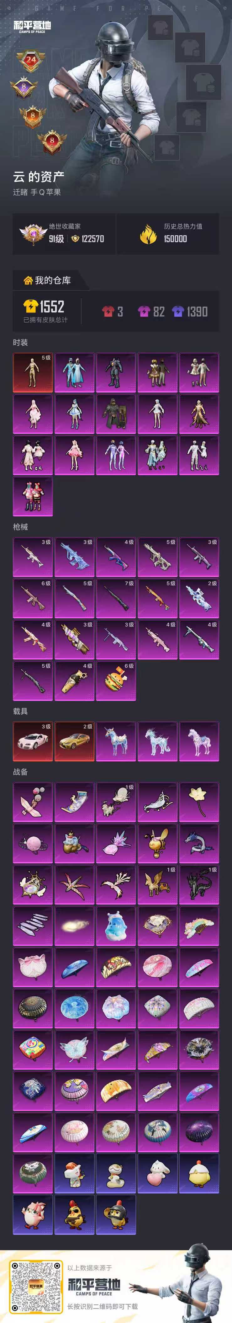 hs64087苹果手Q-24王牌印记-1红装-15粉装-18特效枪-5载具-热力值-314套装-413枪皮-8卓越印记-8传奇印记
