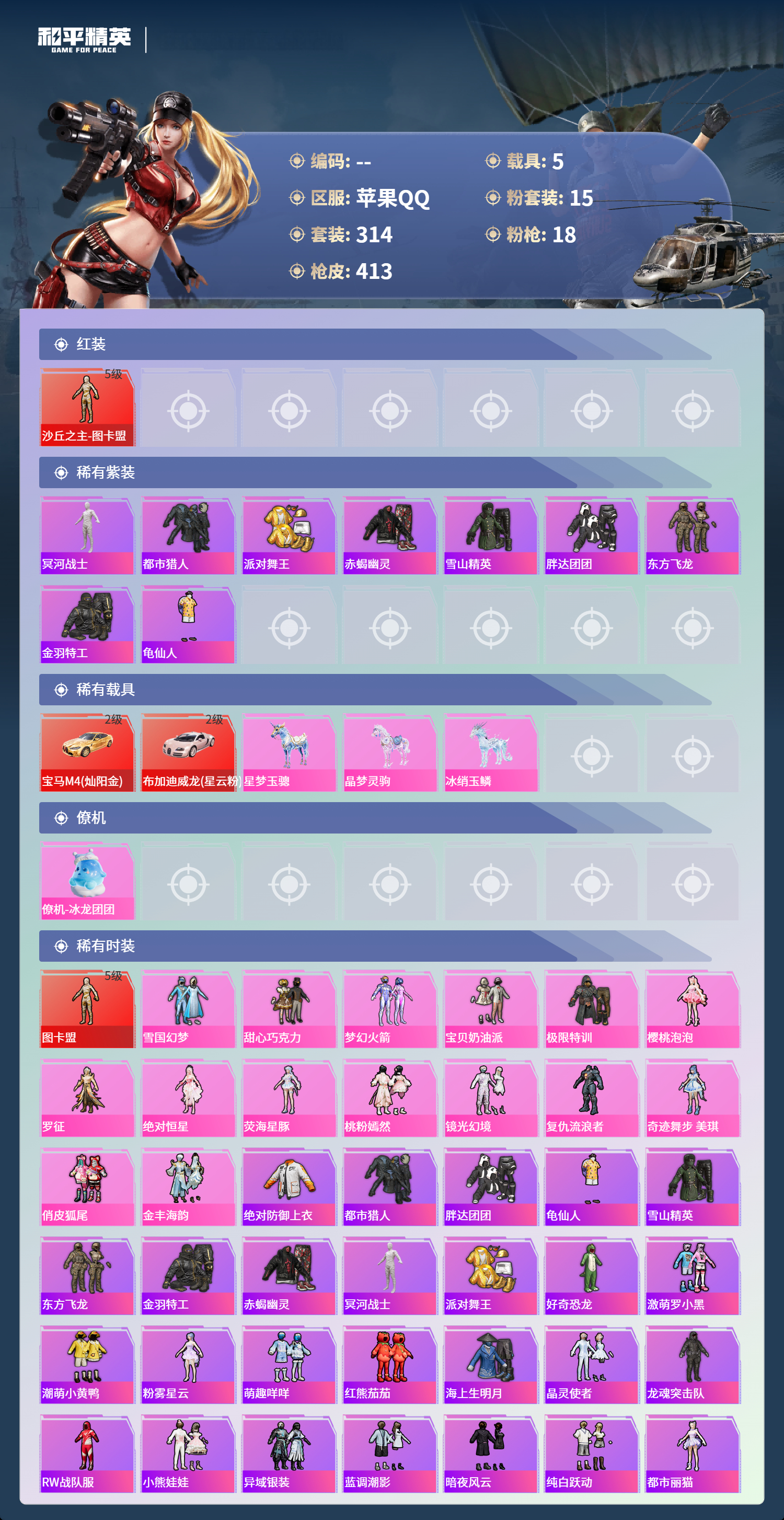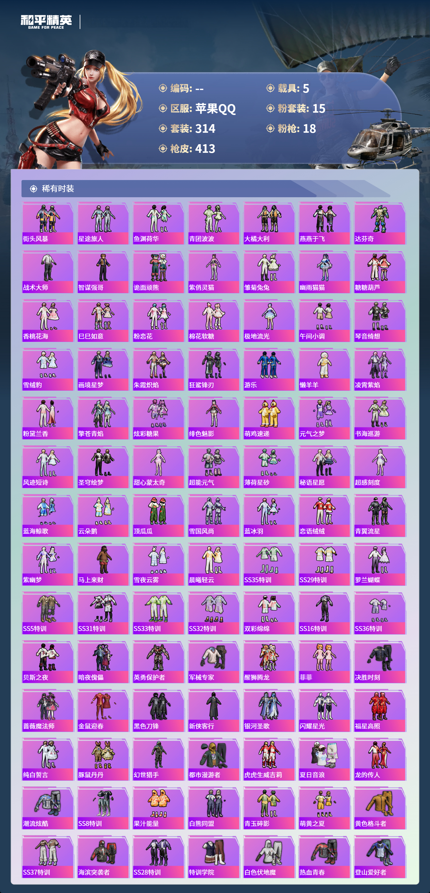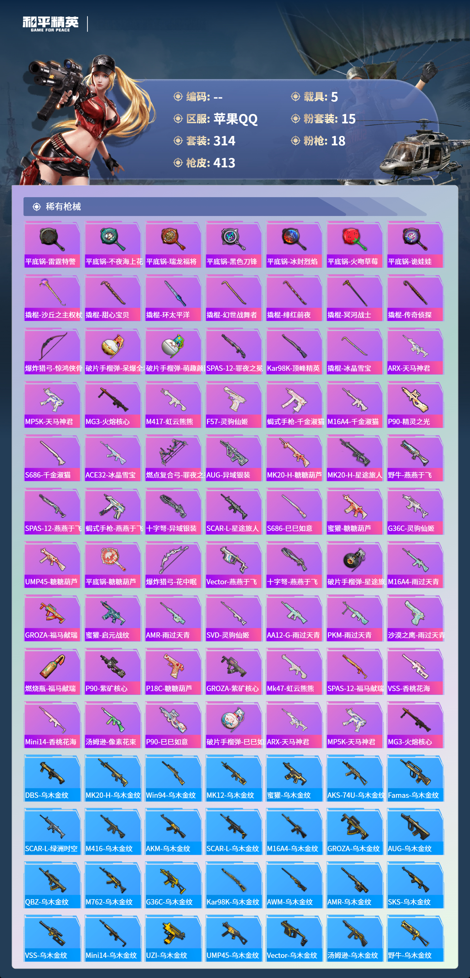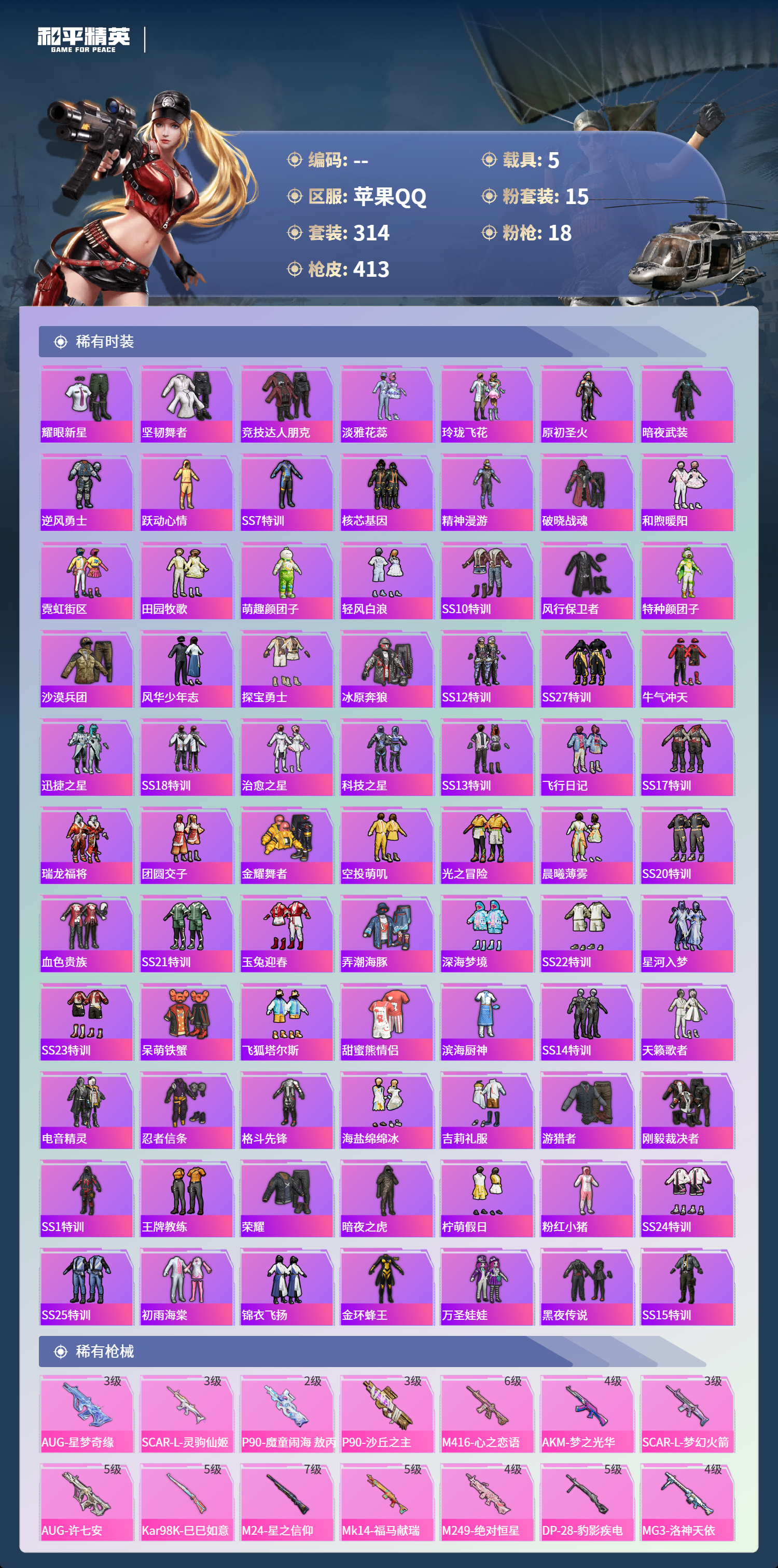 hs64087苹果手Q-24王牌印记-1红装-15粉装-18特效枪-5载具-热力值-314套装-413枪皮-8卓越印记-8传奇印记