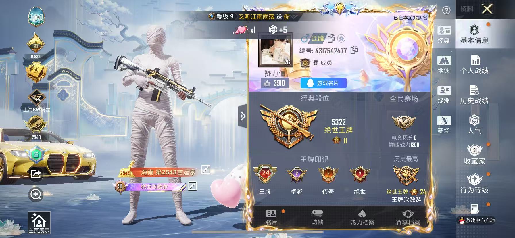 24王牌印记-1红装-15粉装-18特效枪-5载具-热力值-314套装-413枪皮-8卓越印记-8传奇印记