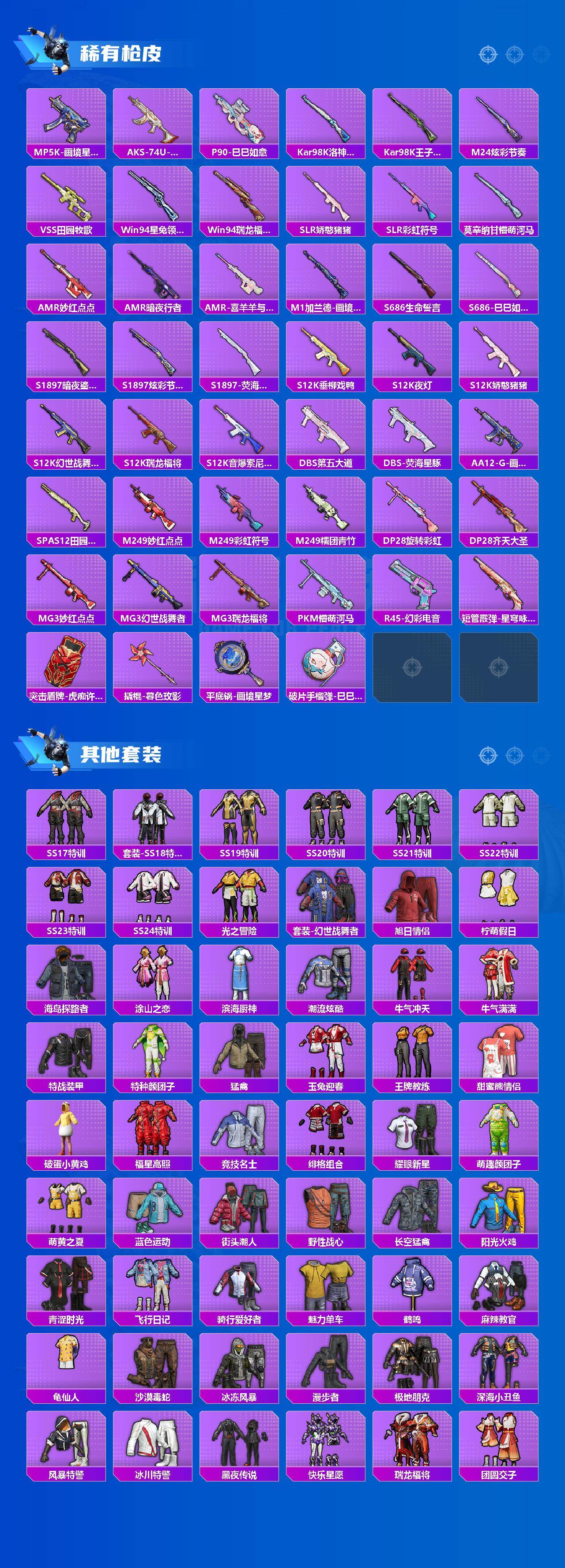 【HP2377】114套装/枪械9/装备195/战备121/王牌印记9/热力值53554/七级AKM-梦之光华/七级M416-风花雪月/五级蜜獾-异瞳寒姬/三级UMP45-萌骑冒险/五级Kar98K-巳巳如意/四级Mk14-福马献瑞/四级DP-28-暗夜鎏金/五级DP-28-豹影疾电/五级MG3-洛神天依/套装-深海小丑鱼/套装-龟仙人/角色-洛天依/粉装-暗夜鎏金/角色-月影灵韵/角色-异瞳寒姬/角色-鸢尾珑雾/AKM-梦之光华/M416-风花雪月/蜜獾-异瞳寒姬/UMP45-萌骑冒险/Kar