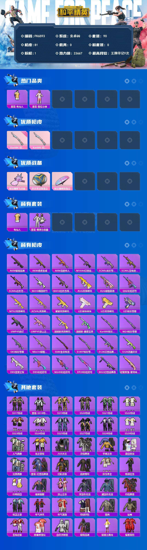 级62-五级Kar98K-巳巳如意-9王牌印记-素材号】安卓 手Q-0粉装-1特效枪-0载具-1粉色飞行器-23667热力值-9王牌印记-90套装-81枪皮 【热门品类】:套装-龟仙人,套装-粉红小猪 【粉色枪皮等级】:Kar98K-巳巳如意(五级) 【粉色枪皮】:Kar98K-巳巳如意 【粉色飞行器】:炫彩糖果飞行器 【粉色降落伞】:环太平洋降落伞,炫彩糖果降落伞 【稀有套装