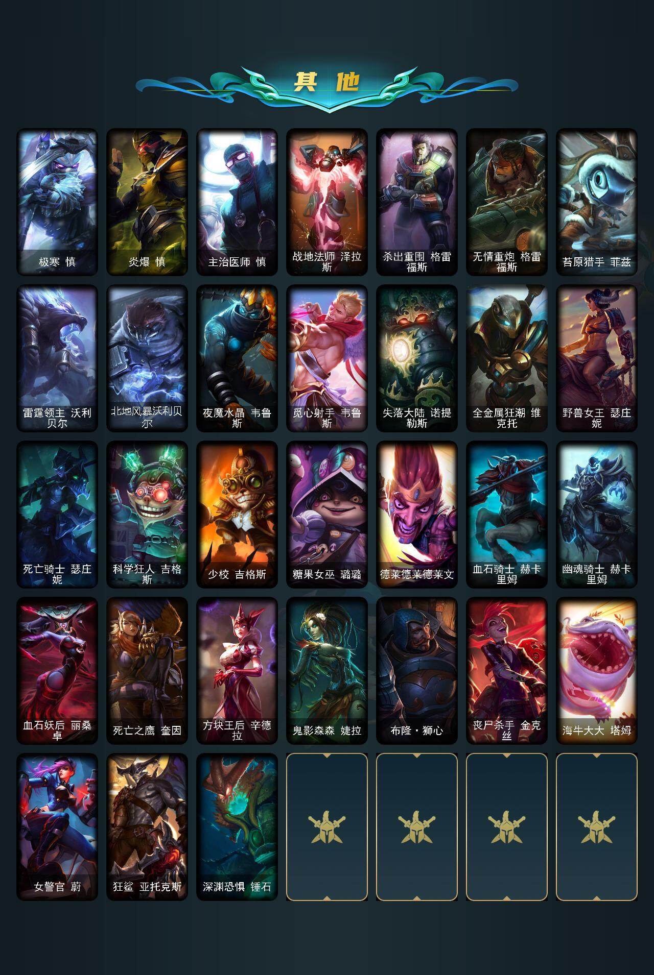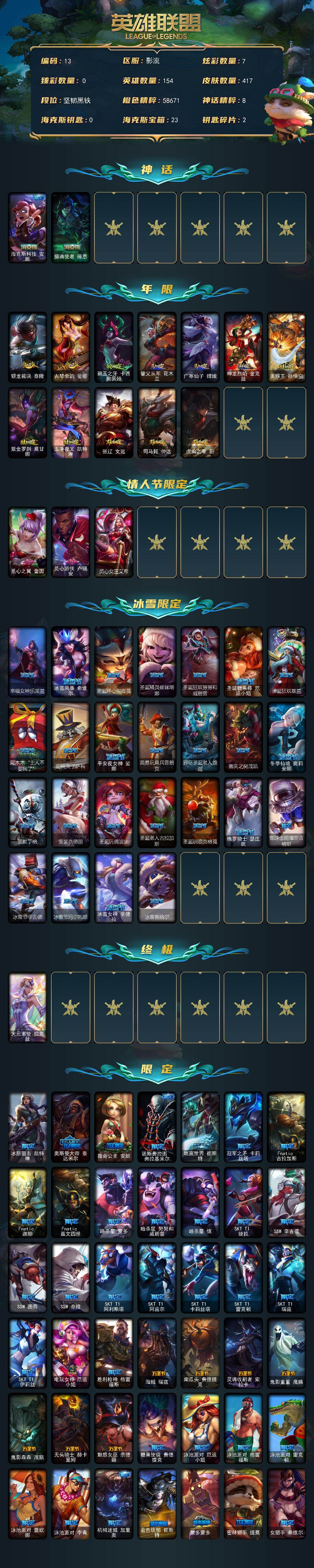 未定级段位-154英雄-417皮肤-7炫彩-1终极-2神话-95限定-35传说-109史诗