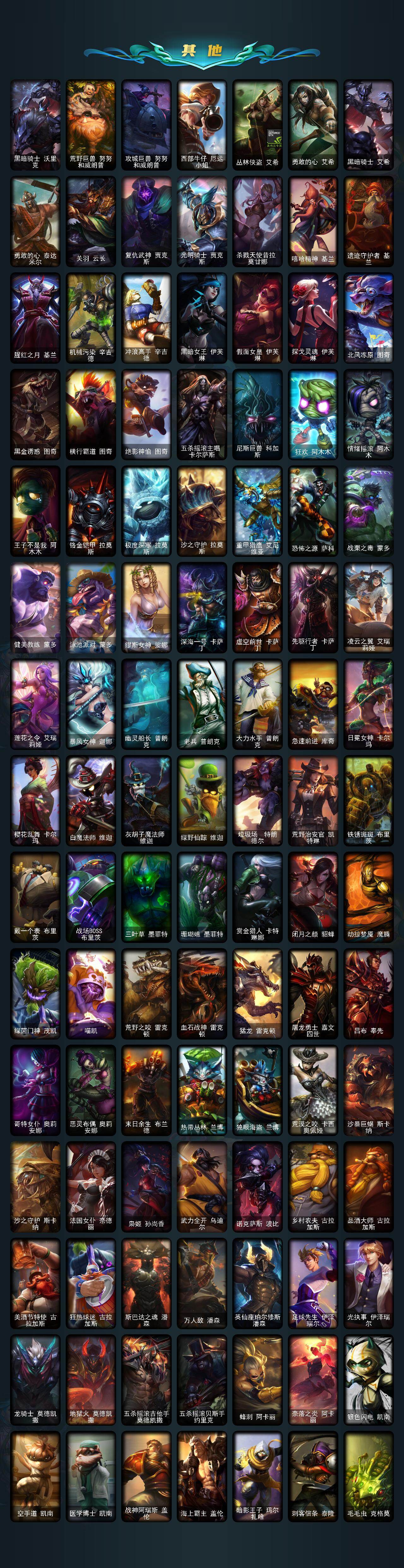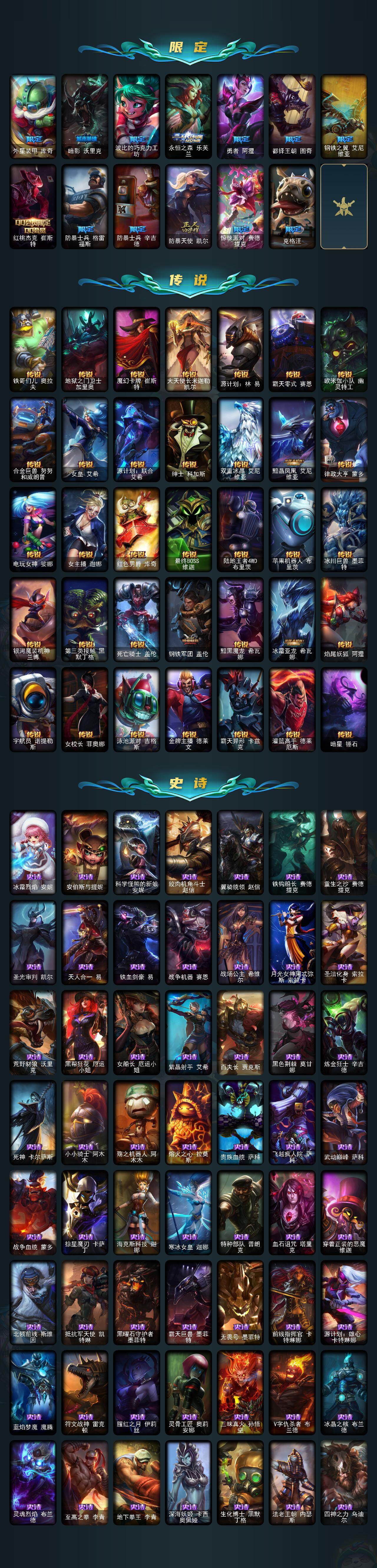 【年限皮肤】:银龙裁决泰隆,古琴余韵娑娜,碧玉之牙卡西奥佩娅,替父从军花木兰,广寒仙子嫦娥,神龙烈焰金克丝,美猴王孙悟空,紫金罗刹莫甘娜,玉净夜叉凯特琳,张辽文远,司马懿仲达,虎痴之拳蔚