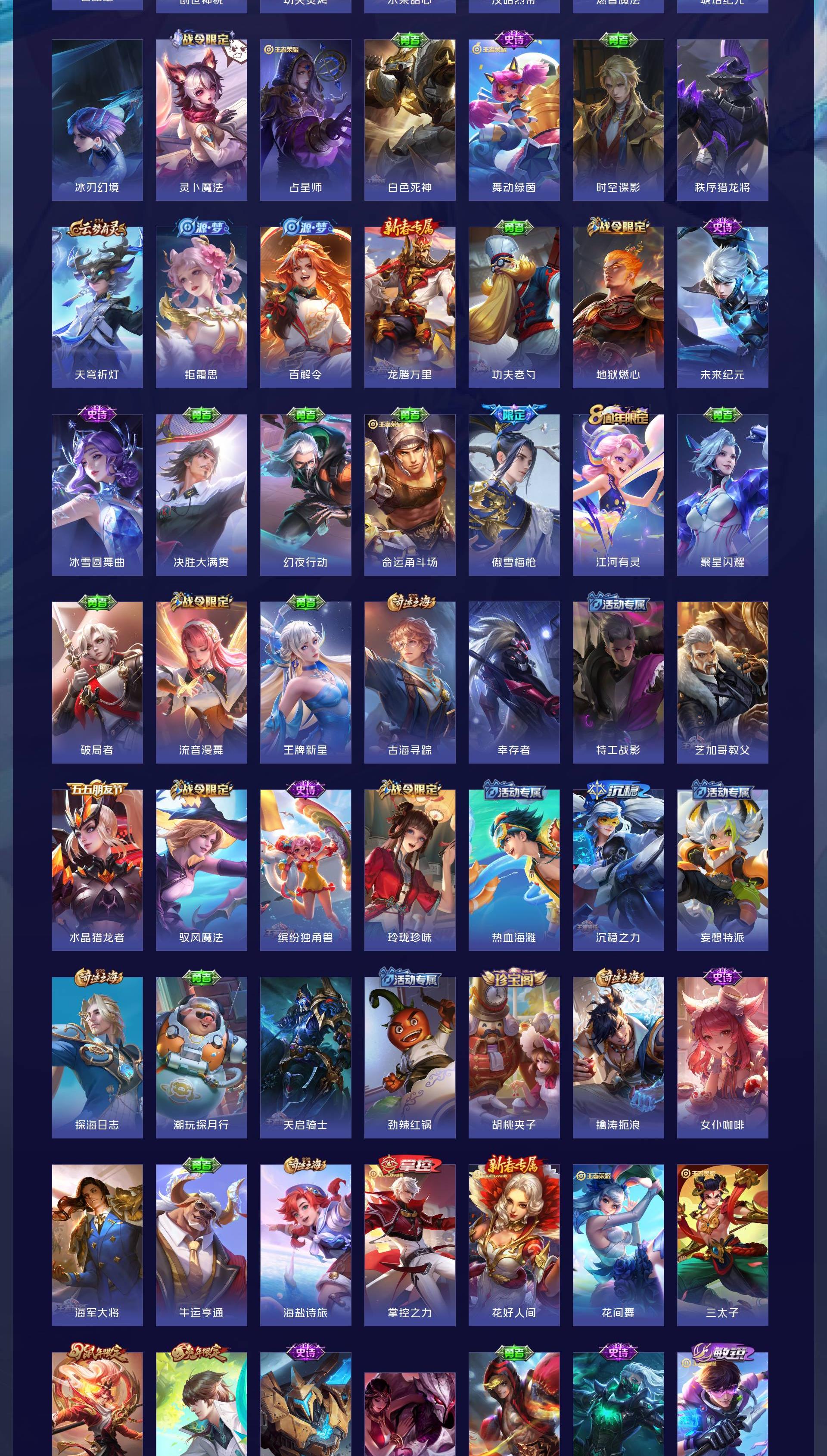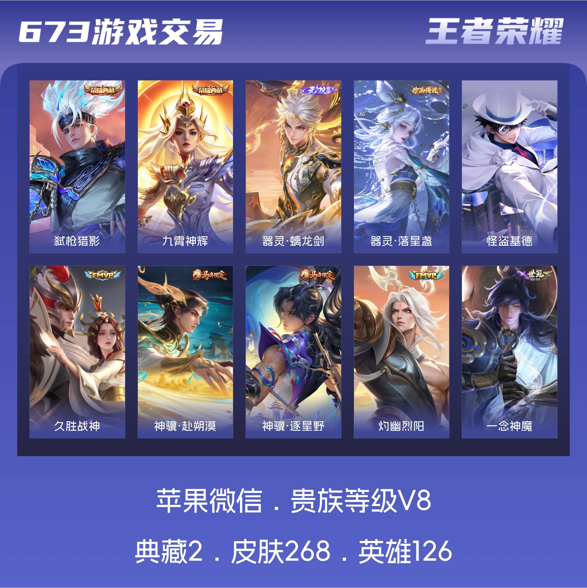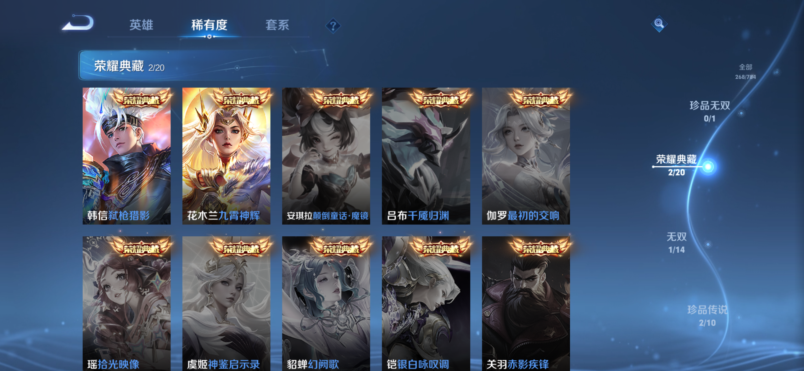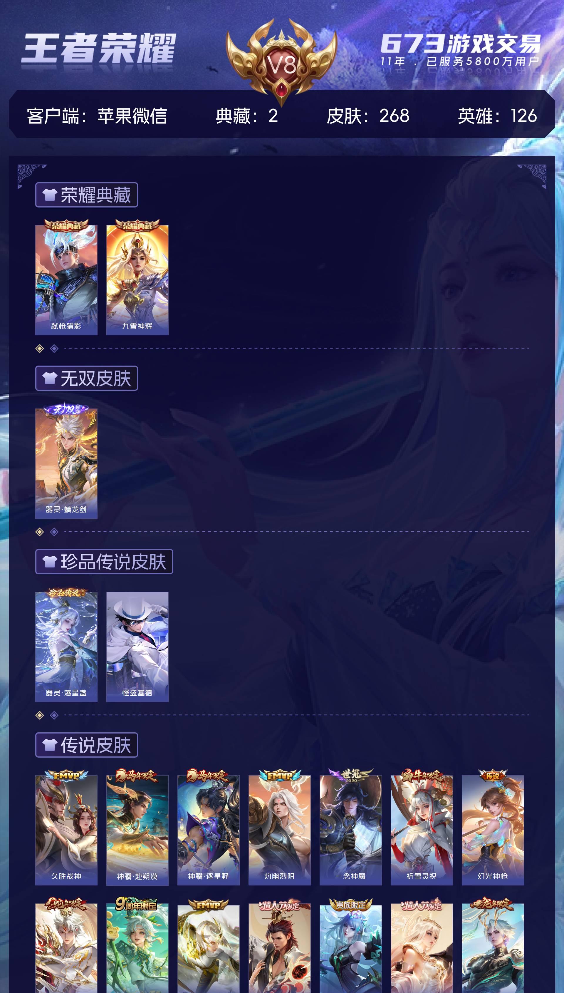 V8 皮肤268 英雄126 最强王者 荣耀典藏2 无双皮肤1 珍品传说2 传说26 其他皮肤244