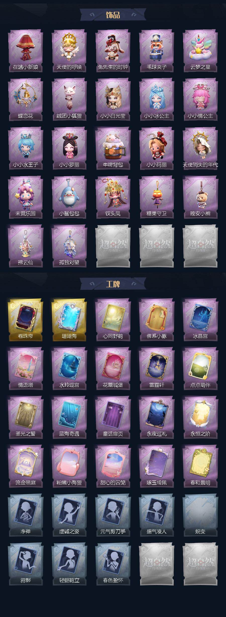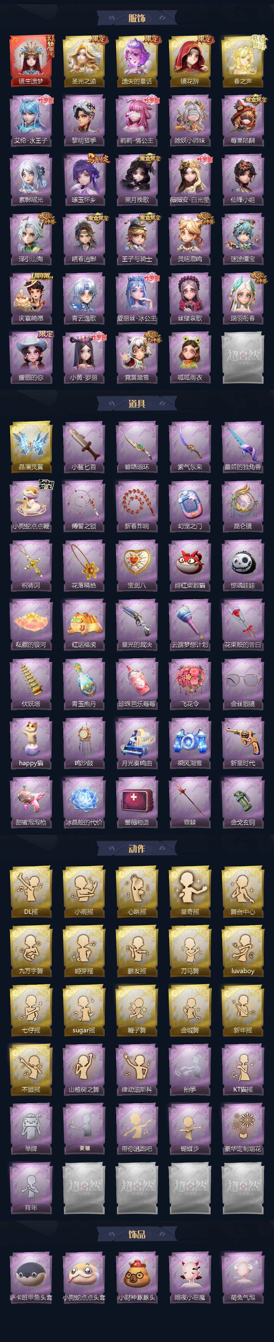 巫铃儿-镜生遗梦,薇薇安-圣光之谕,小黄-遗失的童话,巫铃儿-镜花辞,兰-春之声,艾伦-水王子,艾伦-黎明猎手,莉莉-情公主,莉莉-除妖小师妹,莉莉-莓果陷阱,巫铃儿-素影瑶光,巫铃儿-琢玉怀乡,薇薇安-黑月挽歌,薇薇安-白光莹,薇薇安-仙锋小姐,逍遥-泽引山海,逍遥-绣春逍影,阿念-王子与骑士,阿念-灵昭鹿鸣,阿念-迷途僵宝,阿念-庆宴绮愿,零-青云逸歌,爱丽丝-冰公主,爱丽丝-丝缕哀歌,爱丽丝-瑞羽衔春,爱丽丝-耀眼的你,小黄-罗丽,小黄-霓裳踏雪,小黄-呱呱雨衣,喷气背包-晶澜灵翼,刺刀-
