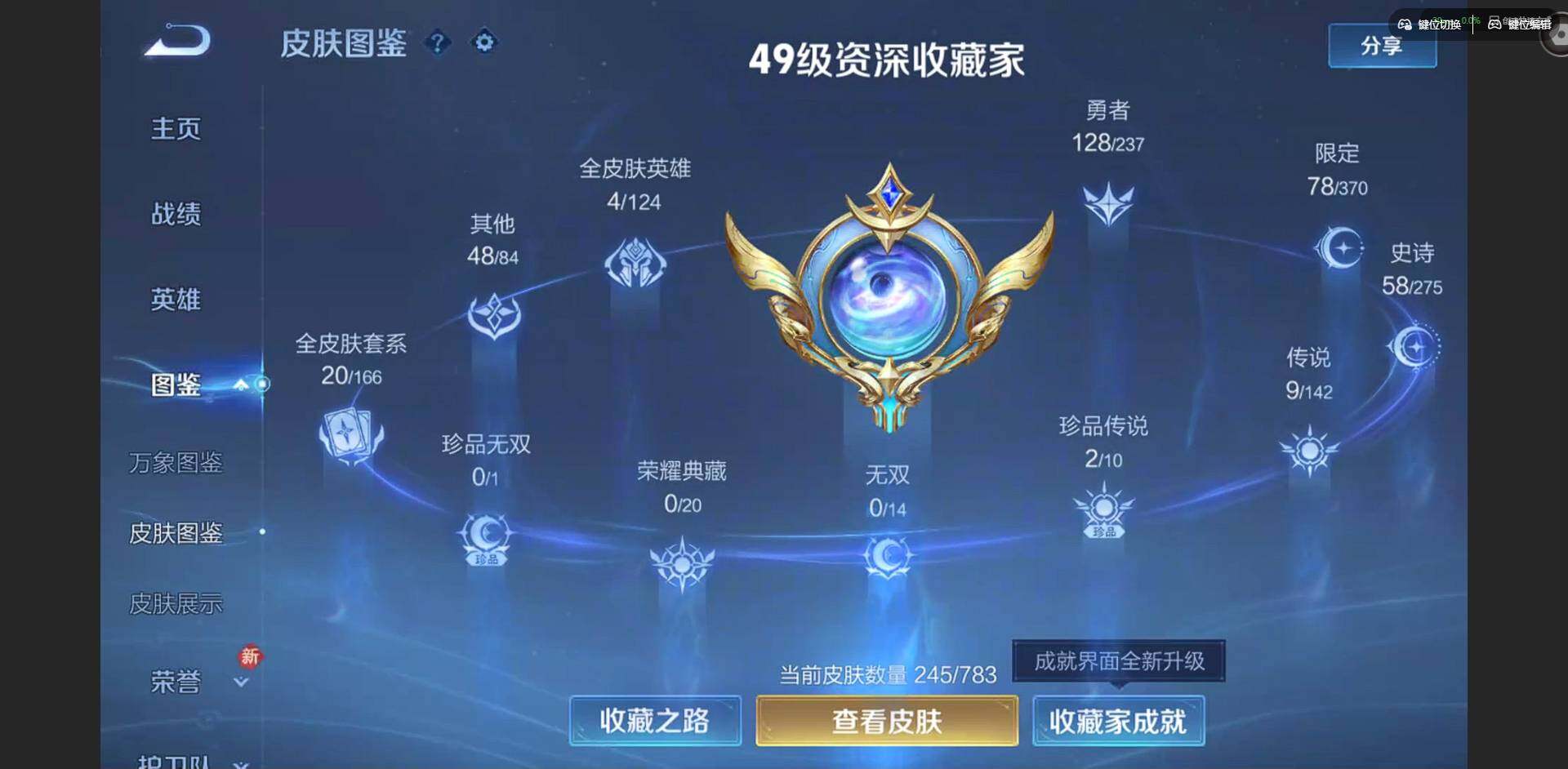 【金标铠】贵族等级: V7 英雄数: 127 皮肤数: 245 珍品传说: 酷