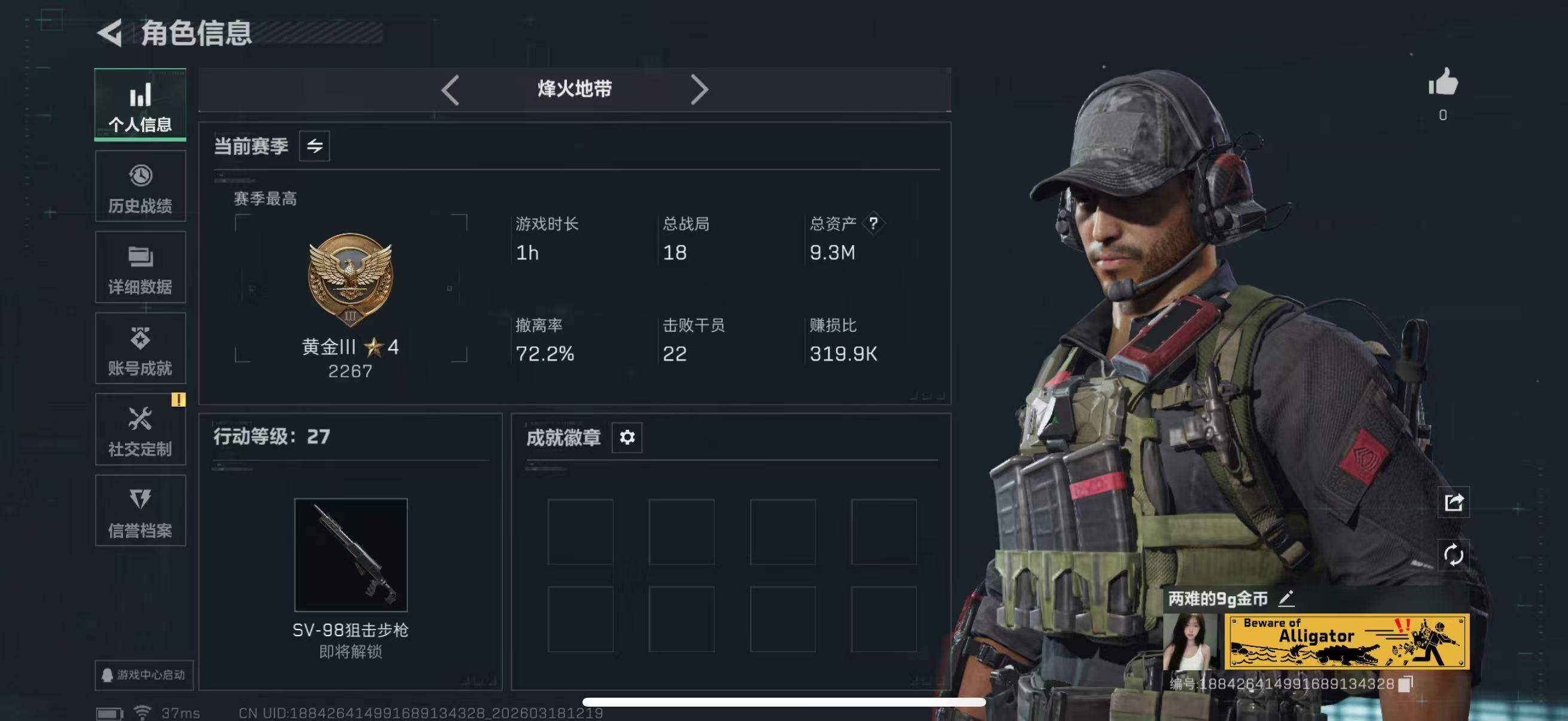 9m总资产-1782k哈夫币-27烽火等级-黄金-12战场等级-列兵