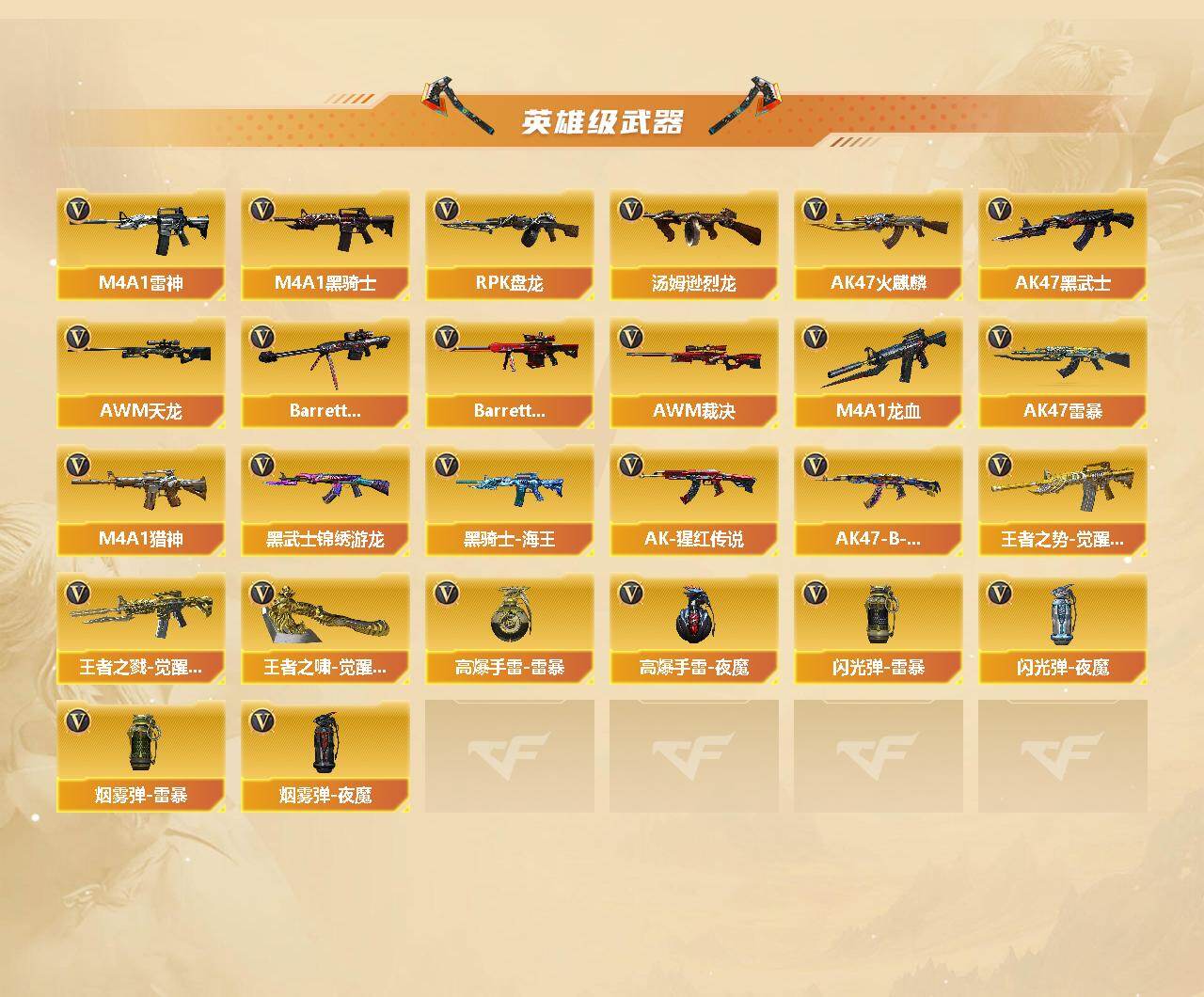 【皮肤】:AWM-裁决-凤灵皮肤,雷神-暗月,火麒麟-雷神,火麒麟-平天大圣,毁灭-战神张飞,M4A1-千变-孔明皮肤,无影-暗月,无影-能量核心,天启-暗月,战神-粉色甜心皮肤,战神-紫绶金章皮肤,战神-流金岁月皮肤*2,AK47-B-常胜将军-曹操*2,AK47-B-常胜将军-刘备