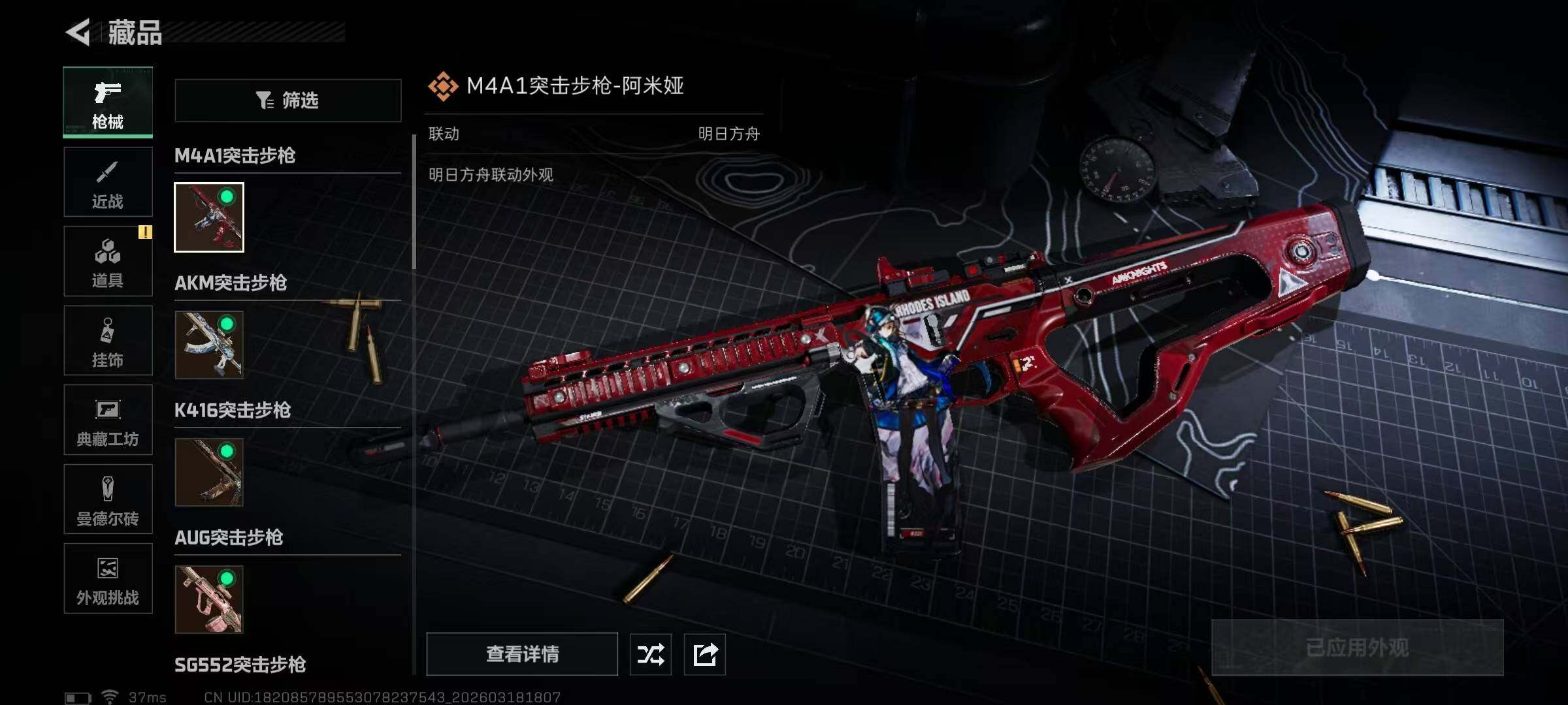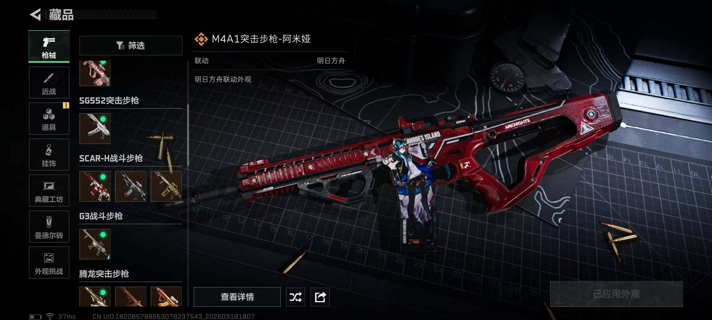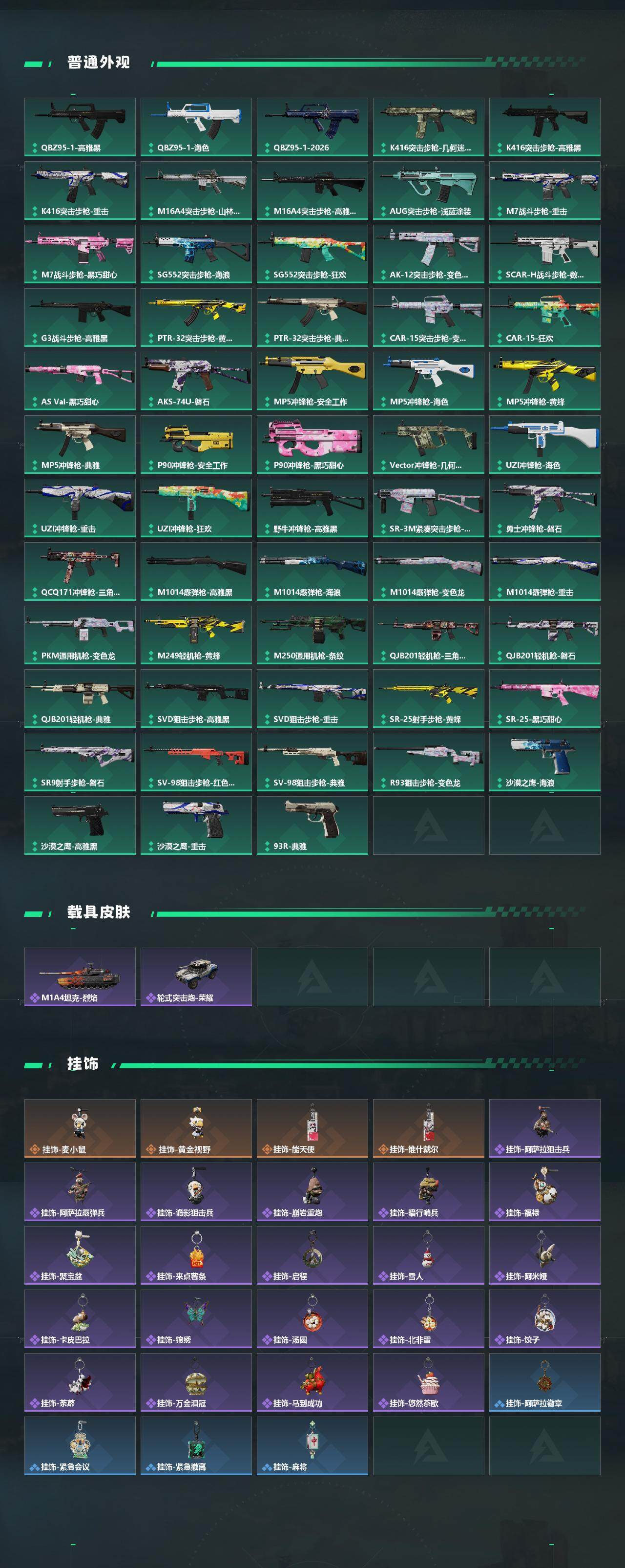 【传说外观】:M4A1突击步枪-阿米娅,AKM突击步枪-锦绣,K416突击步枪-行动记录,AUG突击步枪-悠然茶歇,SG552突击步枪-运动员,SCAR-H战斗步枪-水墨云图,SCAR-H战斗步枪-启航,SCAR-H战斗步枪-荼蘼,