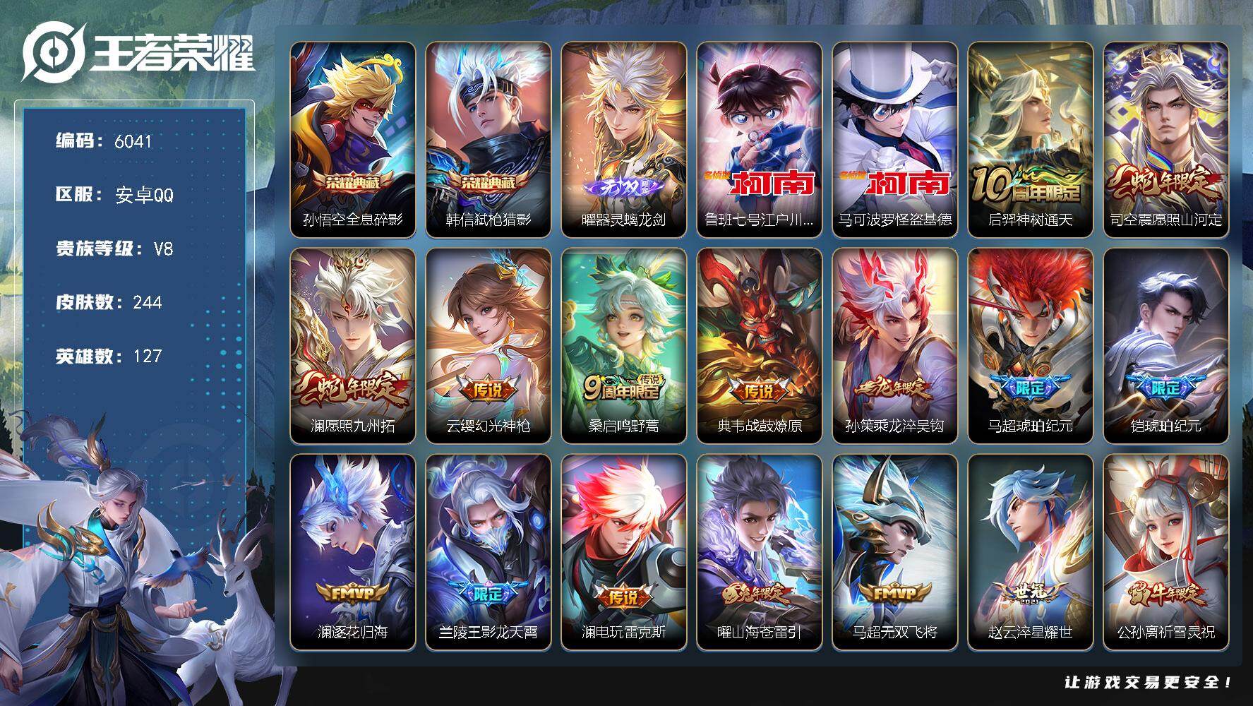 997-[17778074]可二次 幽冥眼安卓手Q395区244皮2典藏22传说1无双2珍品传说V8 营地ID1775937240最强王者【珍品传说皮肤】:怪盗基德,江户川柯南【无双皮肤】:器灵·螭龙剑【荣耀典藏】:全息碎影,弑枪猎影【优质限定皮肤】:无双飞将,神威,山海·苍雷引,祈雪灵祝【传说皮肤】:久胜战神,无双飞将,神树通天,地狱之眼,冠军飞将,影龙天霄,愿照·山河定,幻光神枪,愿照·九州拓,电玩·雷克斯,逐花归海,鸣野蒿,零号·赤焰,琥珀纪元,琥珀纪元,乘龙·淬吴钩,山海·苍雷引,淬星