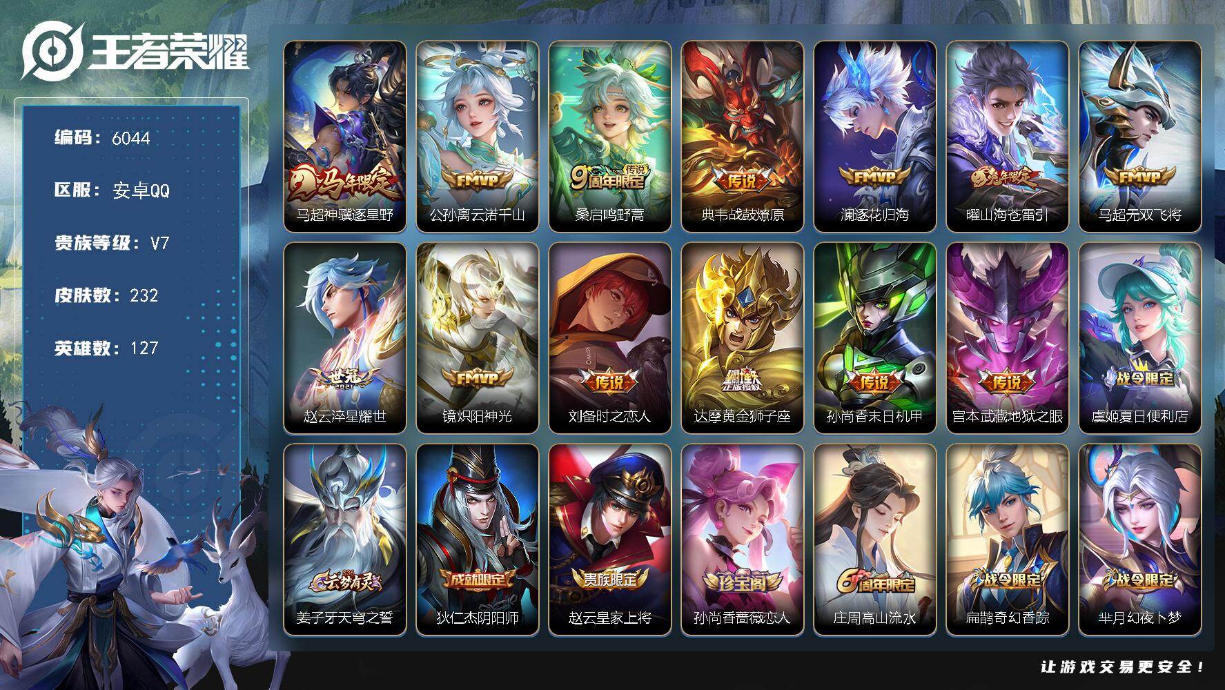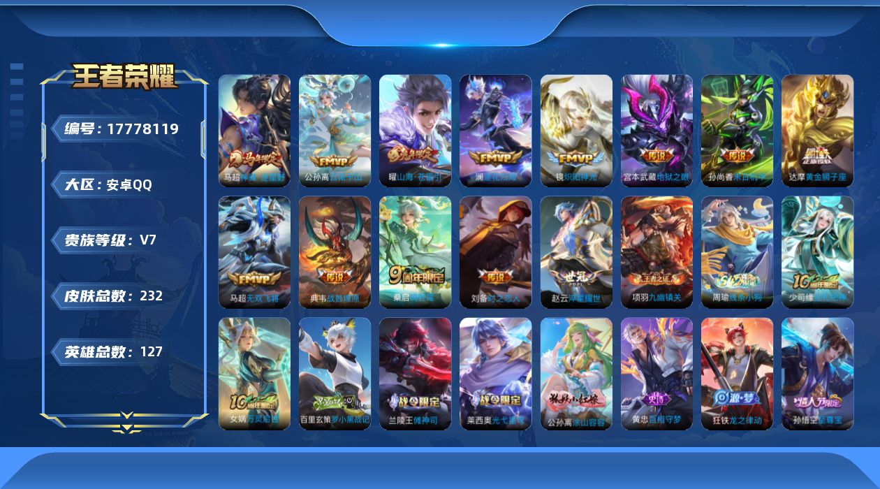 556-[17778119]幽冥眼安卓手Q398区232皮0典藏13传说0无双V7 营地ID1840206245至尊星耀I【优质限定皮肤】:至尊宝,山海·苍雷引,无双飞将【传说皮肤】:神骥·逐星野,时之恋人,末日机甲,淬星耀世,战鼓燎原,云诺千山,黄金狮子座,地狱之眼,炽阳神光,逐花归海,鸣野蒿,山海·苍雷引,无双飞将【史诗皮肤】:缤纷独角兽,电玩小子,九幽镇关,罗小黑战记,傩神司,星界特工,顽趣,天秀·启明,晚萤,巫礼祀神,万灵启世,幽灵船长,光弋星穹,舞动绿茵,修罗,至尊宝,涂山容容,百相守