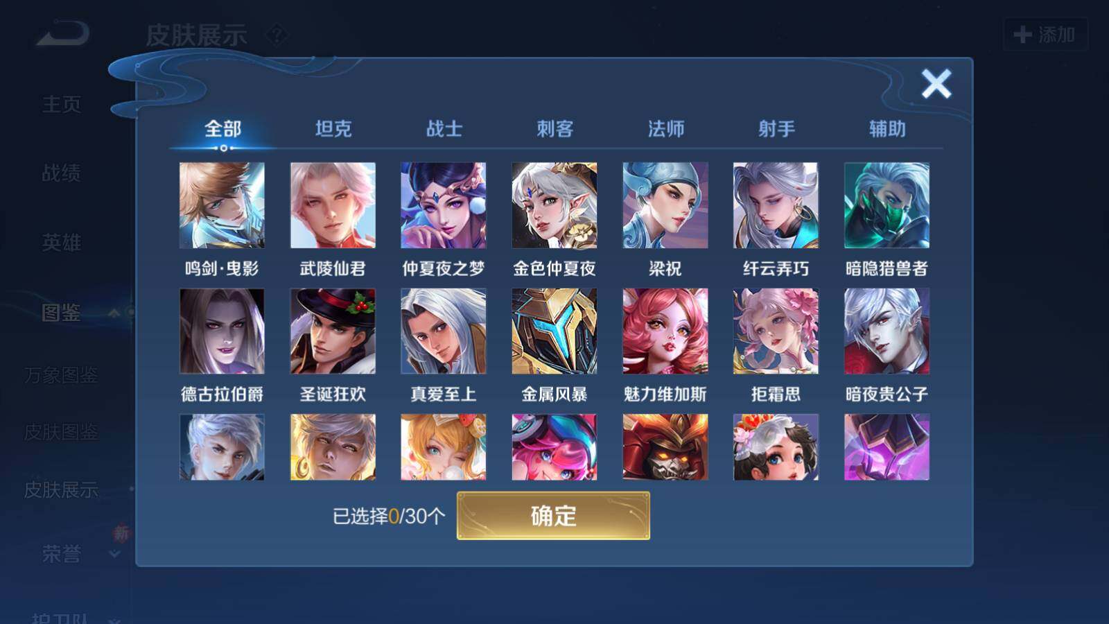 【限定皮肤】:白起狰,狄仁杰阴阳师,小乔纯白花嫁,虞姬凯尔特女王,赵云皇家上将,嬴政优雅恋人,嬴政白昼王子,庄周蜃楼王,高渐离死亡摇滚,孙膑妖精王,扁鹊炼金王,白起夜都怪侠,芈月重明,吕布猎兽之王,周瑜真爱至上,夏侯惇朔风刀,甄姬游园惊梦,曹操烛龙,典韦穷奇,马可波罗暗影游猎,狄仁杰魔术师,狄仁杰万华元夜,达摩沙漠行僧,项羽海滩派对,老夫