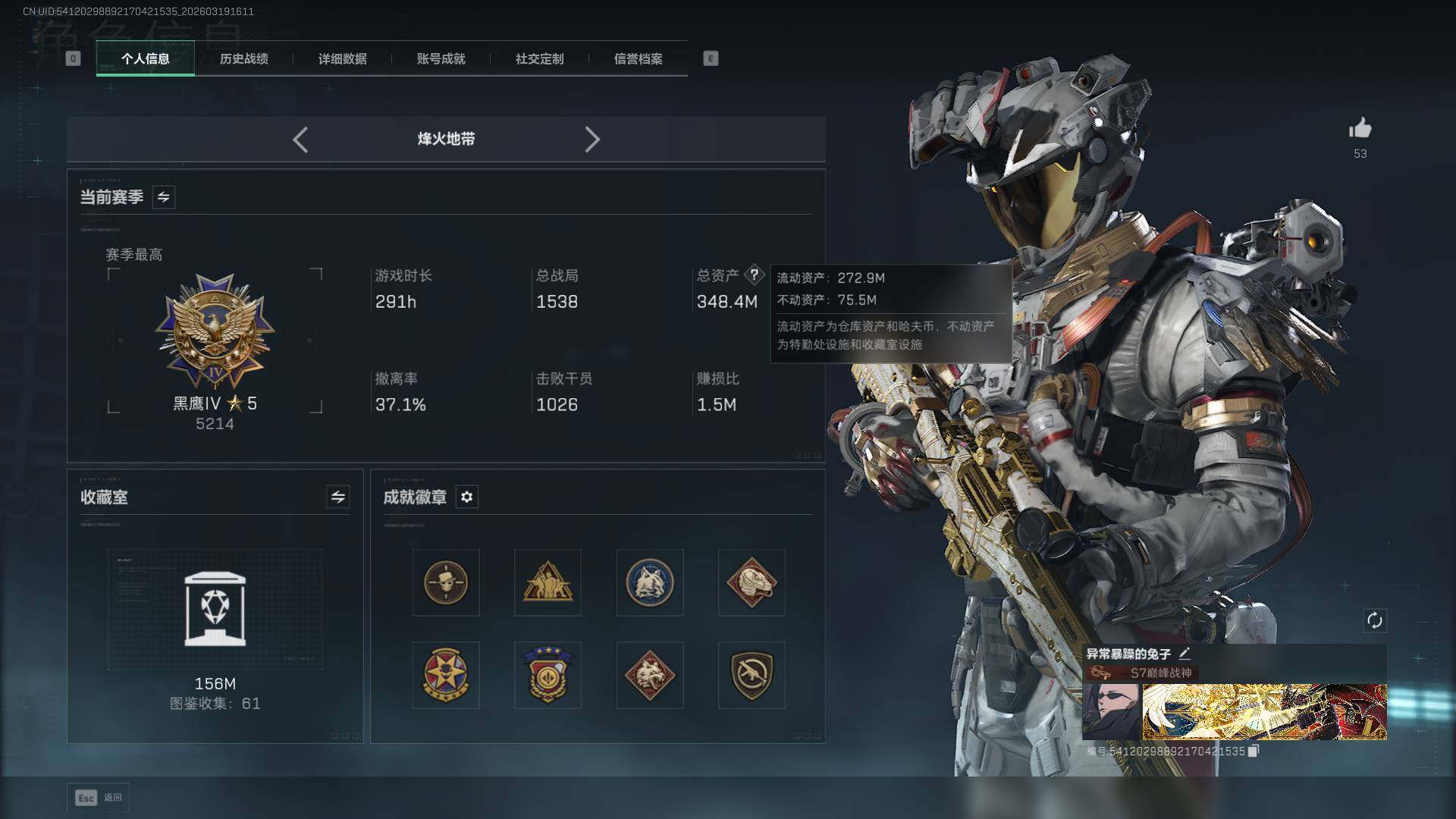 总资产:348.4m,流动资产:272.9m-1干员红皮:威龙 凌霄戍卫-刀皮:暗星,信条