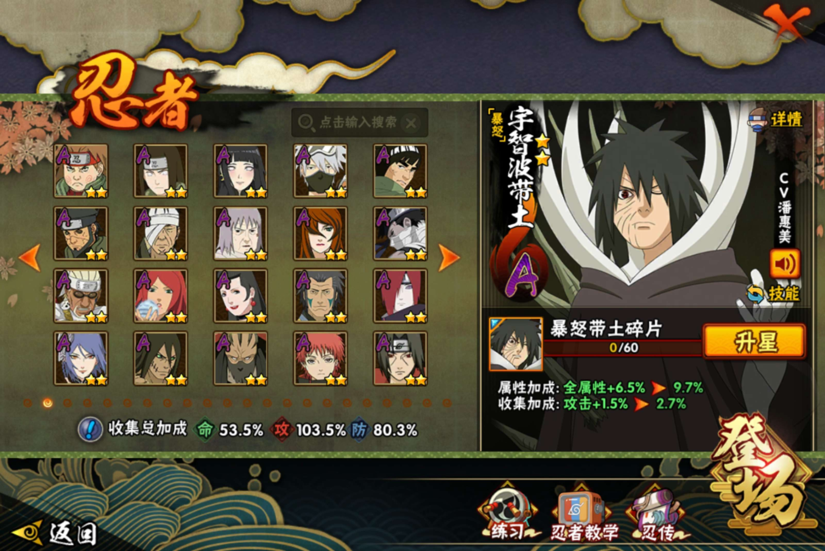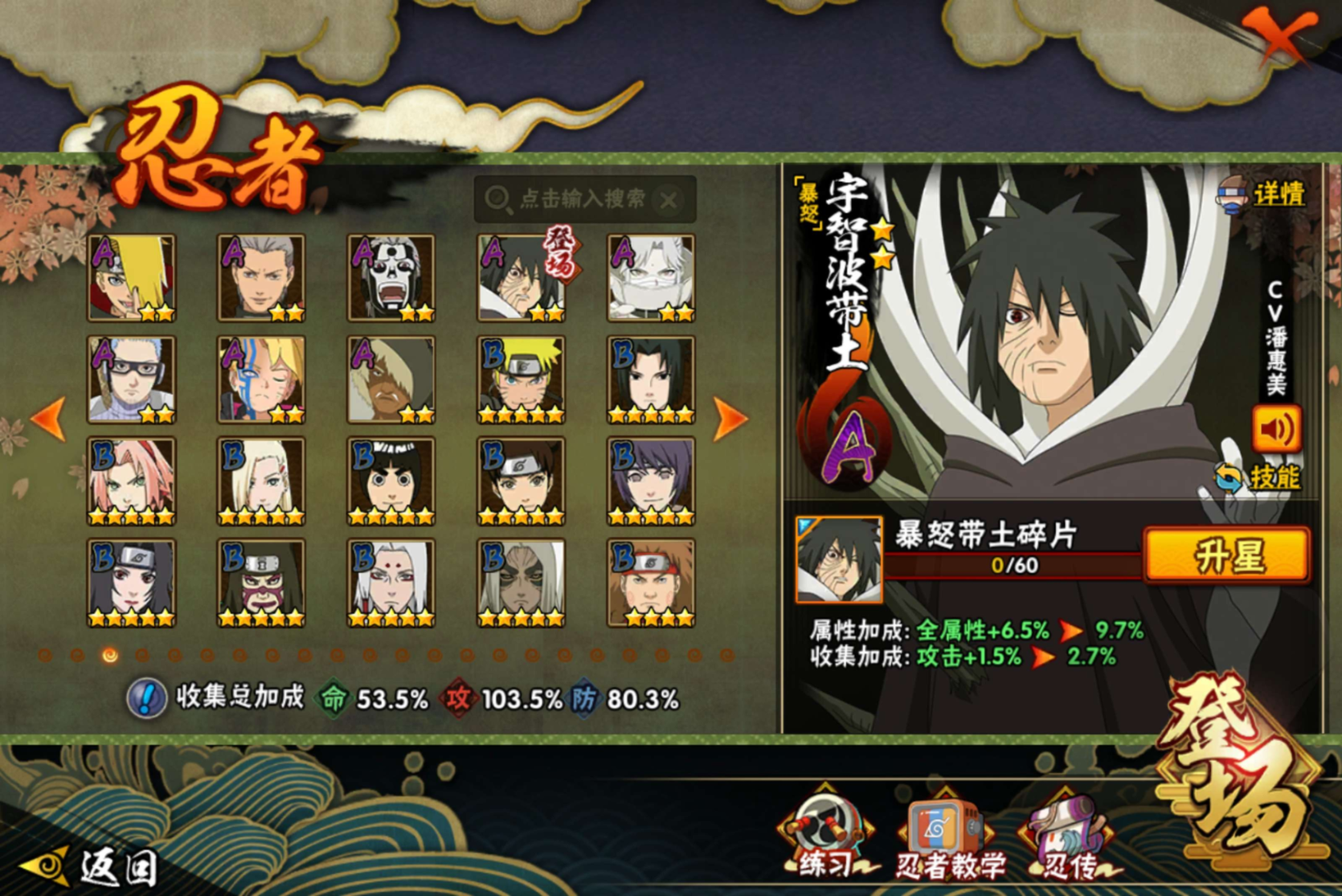 【S级忍者】旗木卡卡西「须佐能乎」(3星),自来也「传说中的三忍」(3星),宇智波斑「秽土转生·解」(3星),宇智波佐助「永恒