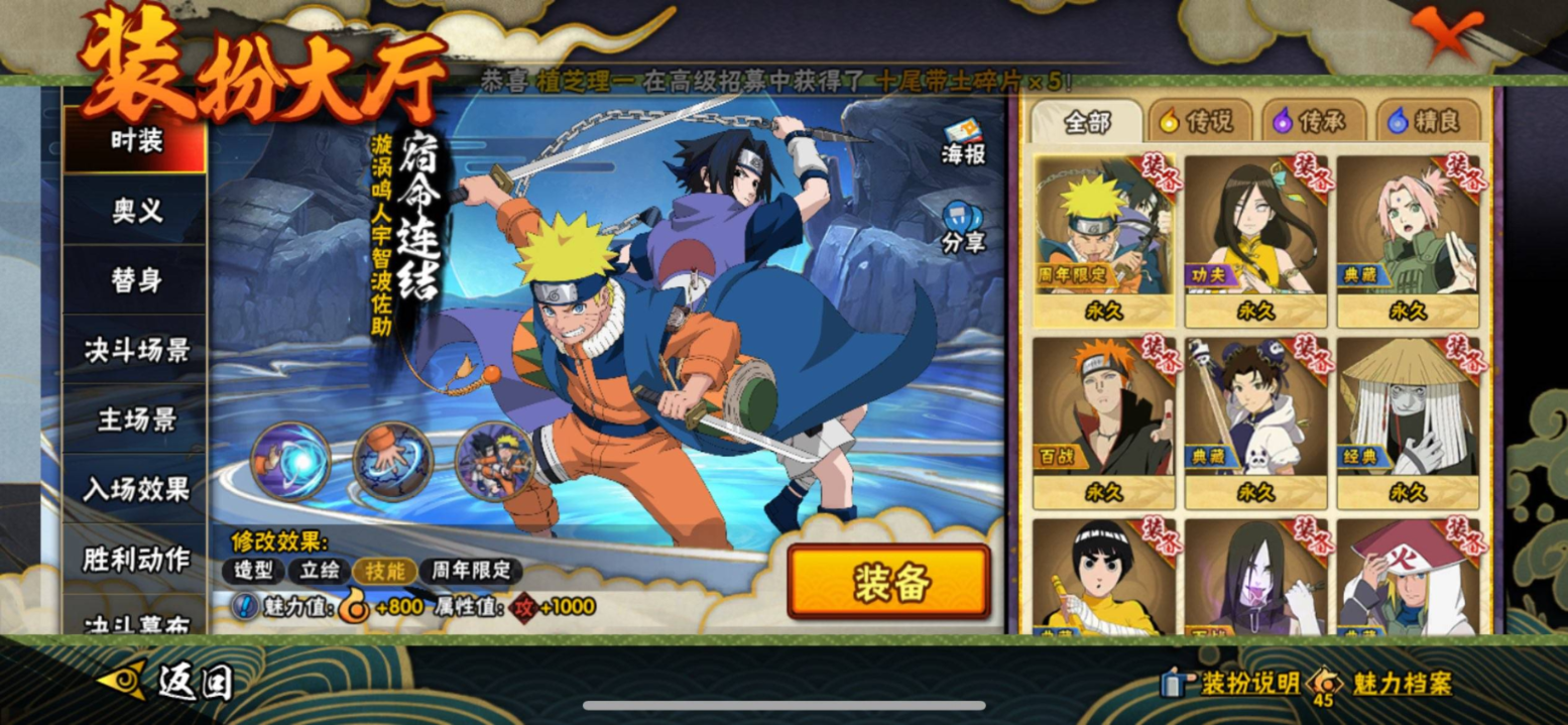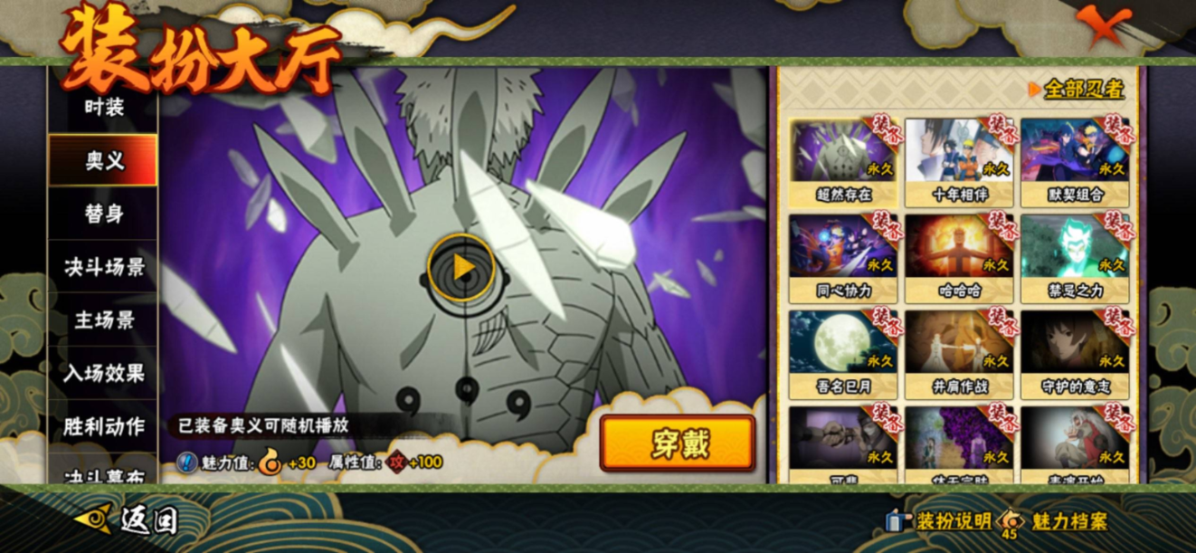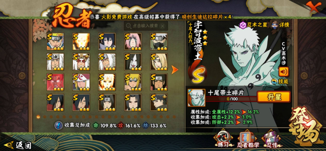 【S级忍者】宇智波带土「忍界大战」(3星),迈特凯「死门」(3星),旗木卡卡西「须佐能乎」(3星),自来也「传说中的三忍」(3星),宇智波斑「秽土转生·解」(3星),宇智波佐助「永恒万花筒」(3星),春野樱「忍界大战」(3星),宇智波止水「须佐能乎」(3星),千手柱间「秽土转生」(3星),长门「秽土转生」(3星),漩涡鸣人
