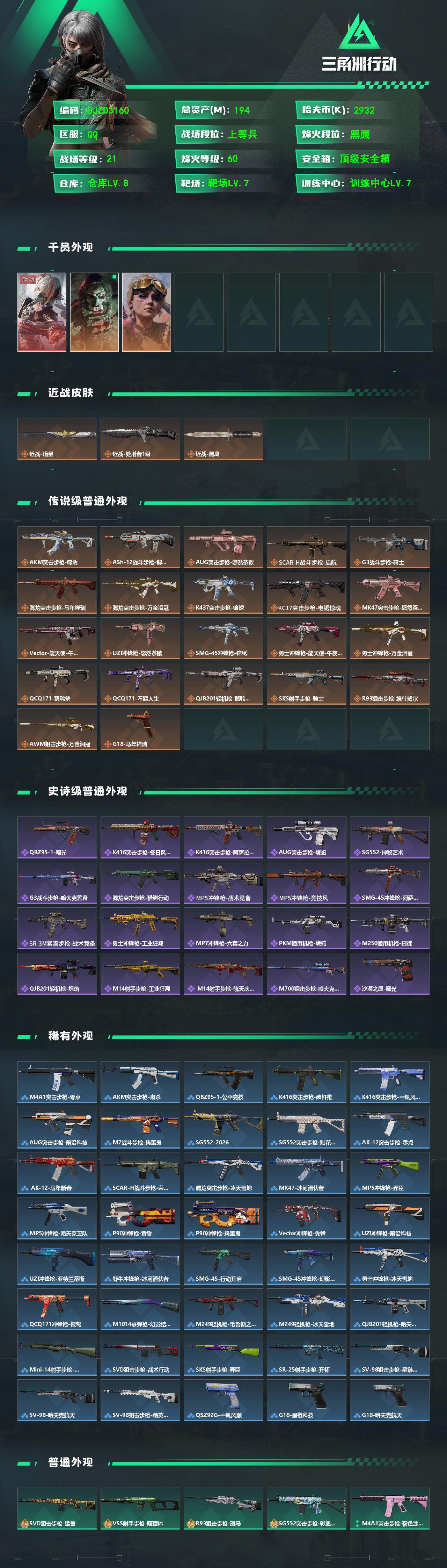 【SJZD3160】总资产(M):194M/哈夫币(K):2932K/哈夫币(K):2932K/传说枪皮数:22/全面战场等级:21_段位:上等兵/烽火地带等级:60_段位:黑鹰/骇爪-维什戴尔/红狼-电锯惊魂/蛊-不羁人生/近战-暗星/近战-处刑者1级/近战-黑鹰/AKM突击步枪-锦绣/ASh-12战斗步枪-鹅鸭杀/AUG突击步枪-悠然茶歇/SCAR-H战斗步枪-启航/G3战斗步枪-骑士/腾龙突击步枪-马年祥瑞/腾龙突击步枪-万金泪冠/K437突击步枪-锦绣/KC17突击步枪-电锯惊魂/MK4