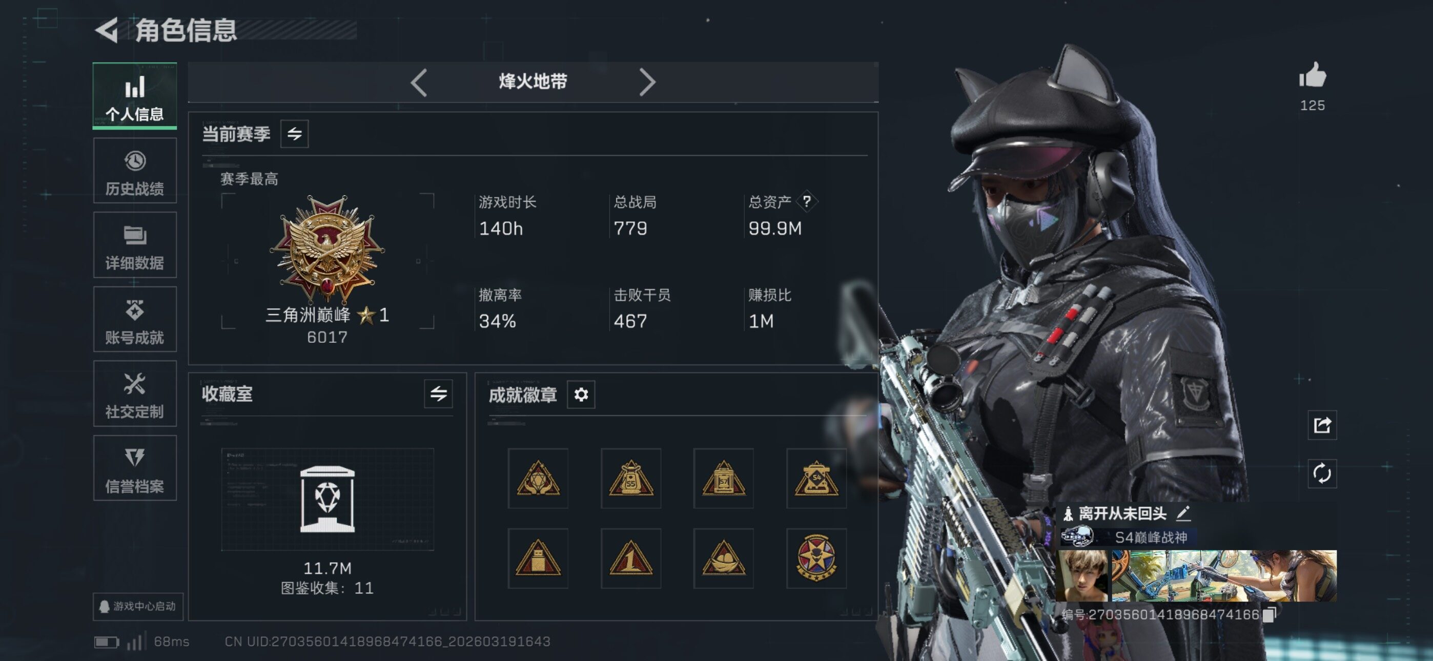 等级:60总资产:99.9M 纯币24 红皮: 黑天际线、飞虎、水墨云图刀皮: 信条,电锯惊魂 砖皮:M7战斗步枪-棱镜攻势S2优品B 特勤处:仓库10,训练7,靶场7