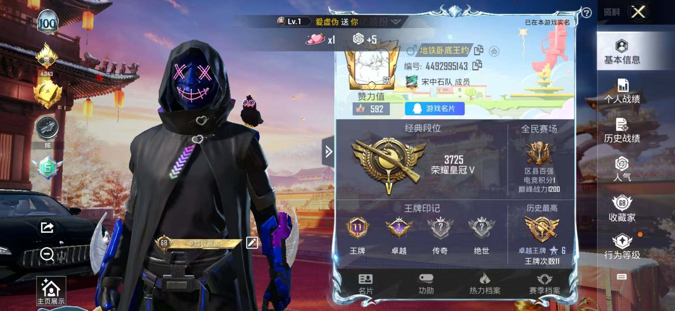 175套装/枪械4/装备339/载具2/战备199/王牌印记11/热力值77910/