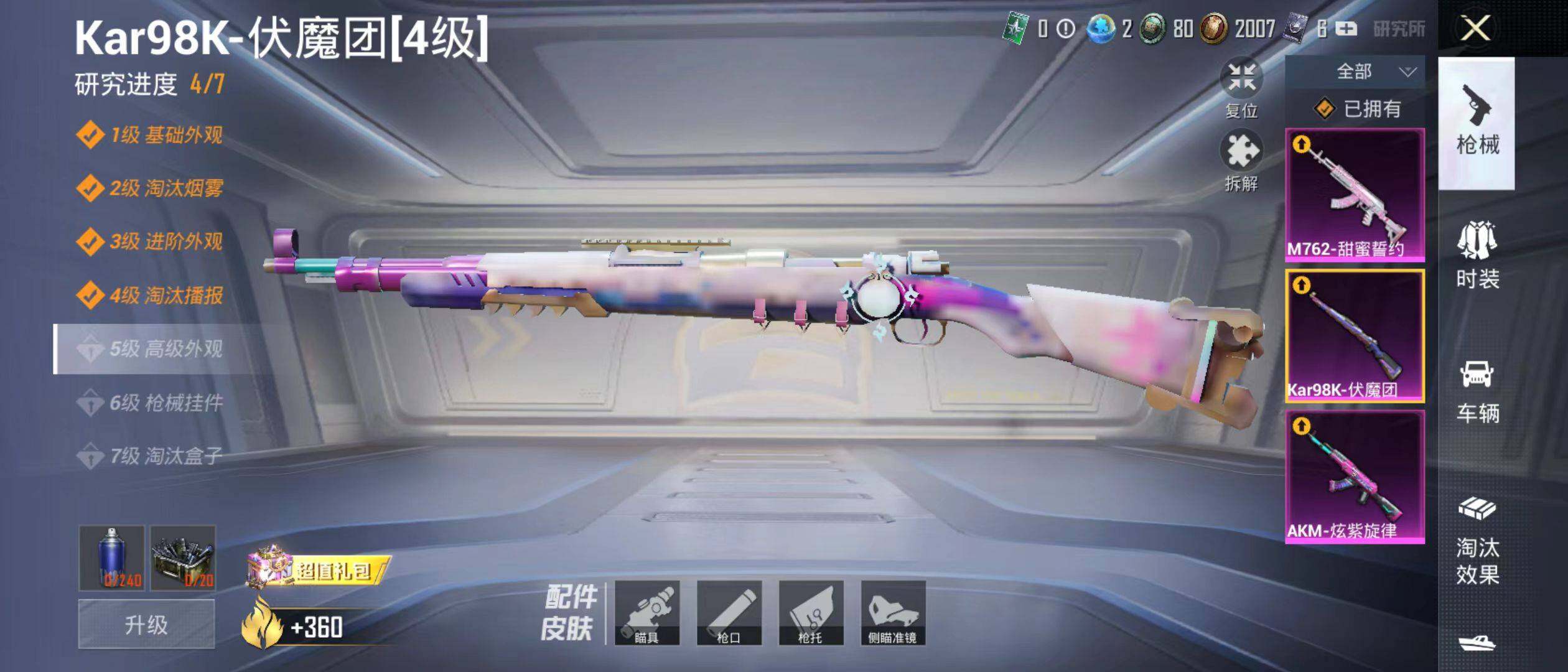 【HP1360】136套装/枪械3/装备213/载具3/战备122/王牌印记2/热力值59798/六级AKM-炫紫旋律/五级M762-甜蜜誓约/四级Kar98K-伏魔团/套装-深海小丑鱼/套装-动感兔斯基人偶服/粉装-金属狂野/粉装-向日葵/粉装-甜蜜誓约/粉装-极致幻想/粉装-炙焰红王/粉装-宝贝奶油派/粉装-天使彩虹糖/粉装-橘柚倾心/粉装-暗夜玫瑰/粉装-酣梦娃娃/粉装-精灵娃娃/特斯拉Roadster(水滴蓝)/双人摩托-双刃魅影(红)/空客H135-蔚蓝之翼/AKM-炫紫旋律/M762