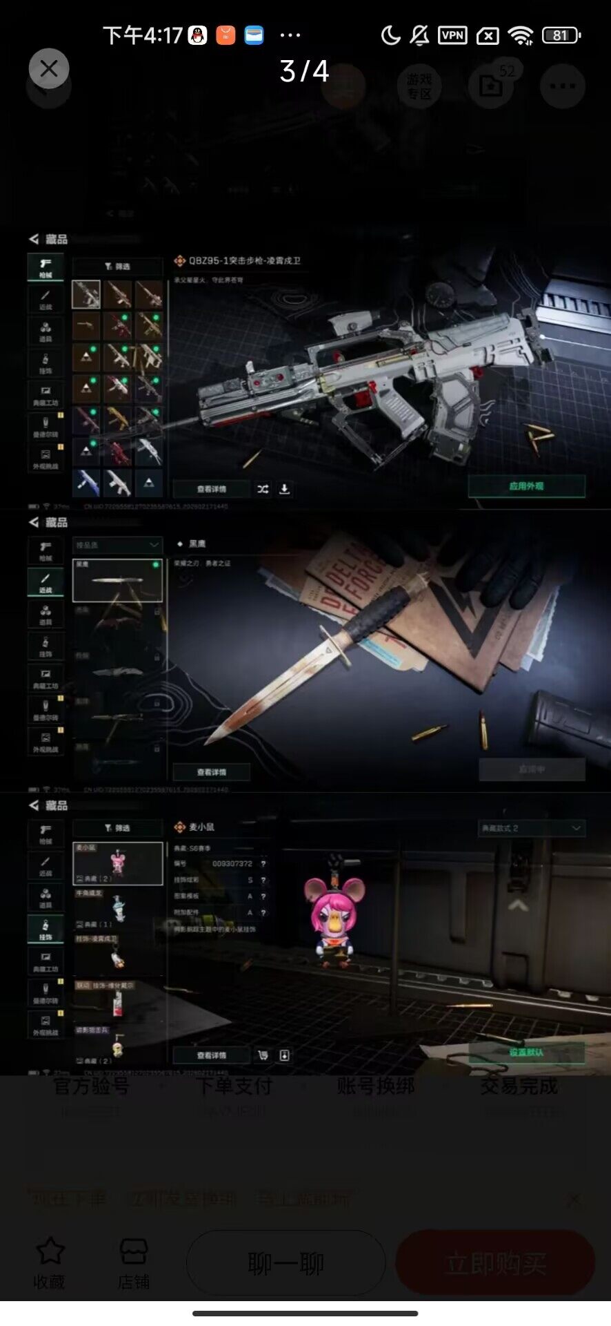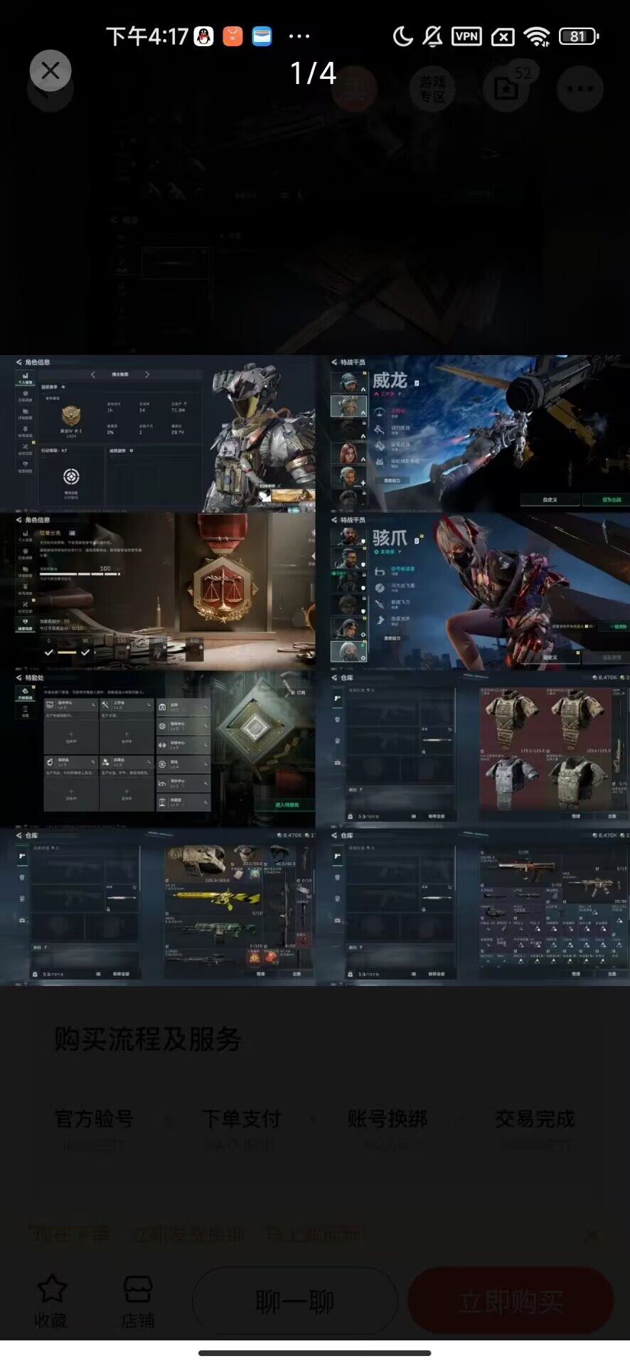 微信【威龙新皮(凌霄戍卫)维什戴尔 20发AWM子弹】三角洲行动 可改实名 行动等级47级 总资产71M 哈夫币8470K 5级训练中心 4级靶场 7级仓库 5级训练中心 1级潜水中心 超算单元 军用电台 K31409 三角洲游戏买号包赔,威龙-凌霄戍卫,骇爪-维什戴尔