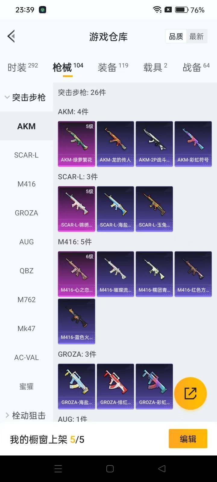 78套装/枪械6/装备119/载具2/战备64/王牌印记8/热力值35499/