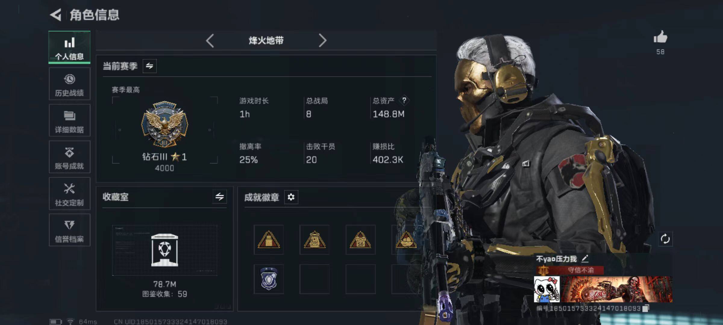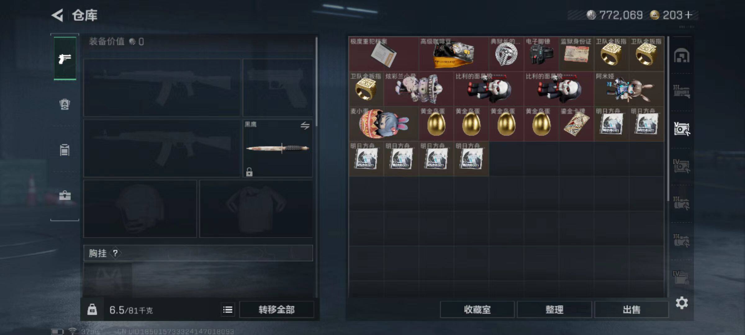 【SJZ42】总资产(M):148M/哈夫币(K):772K/哈夫币(K):772K/全面战场等级:10_段位:列兵/烽火地带等级:60_段位:钻石/红狼-蚀金玫瑰/骇爪-维什戴尔/蜂医-送葬人·无题密令/无名-夜鹰/深蓝-不破誓约/近战-电锯惊魂/近战-黑鹰/野牛冲锋枪-黑潮/沙漠之鹰-天际线/SR-25射手步枪-雪地迷彩/PKM通用机枪-黄铜/G18-马赛克涂装/M4A1突击步枪-蚀金玫瑰/ASh-12战斗步枪-鹅鸭杀/AK-12突击步枪-夜鹰/AK-12突击步枪-特斯拉线圈/SCAR-H战