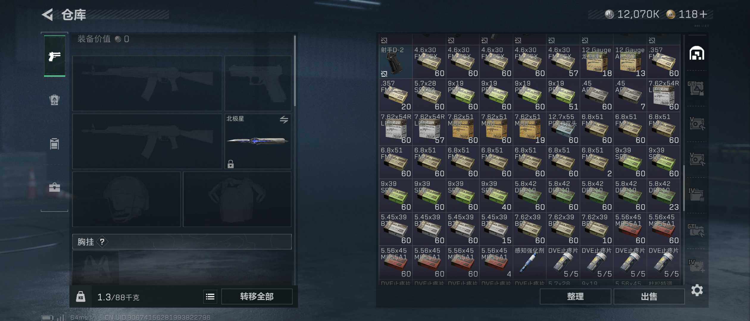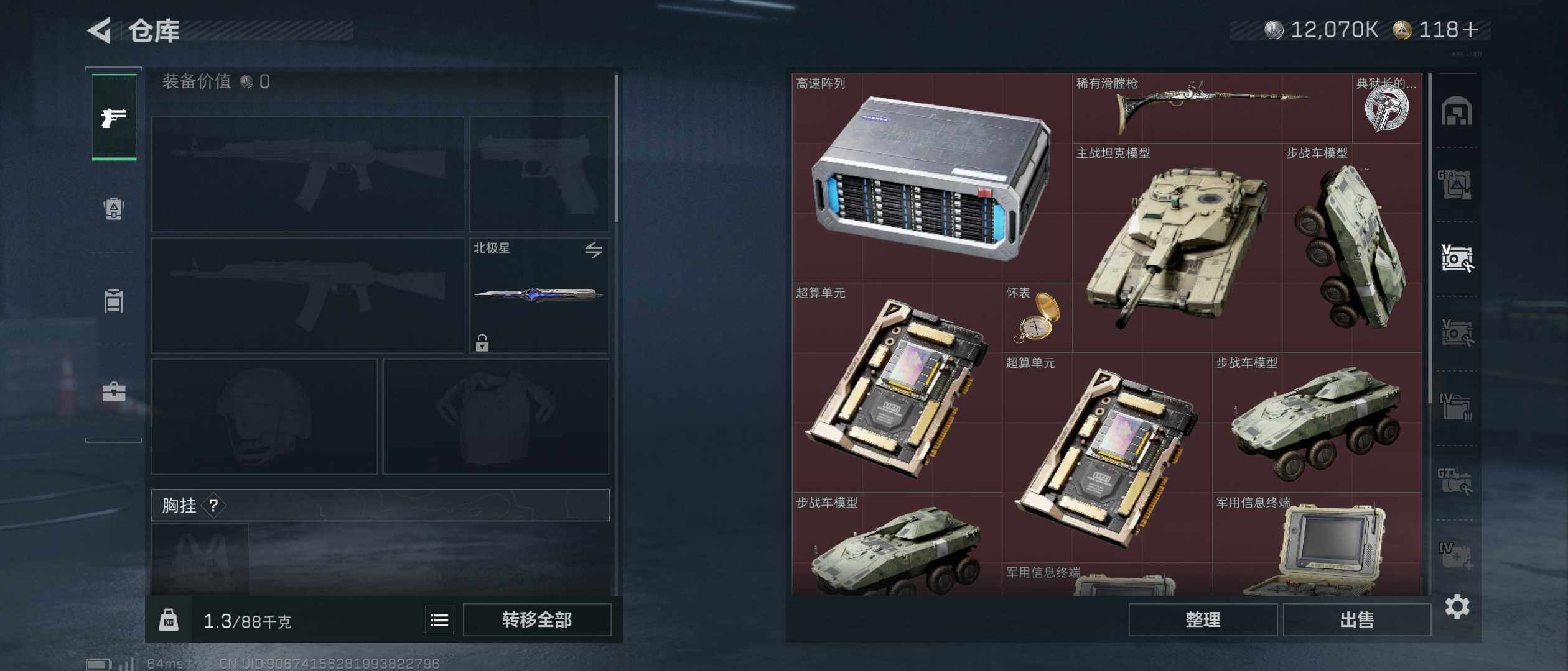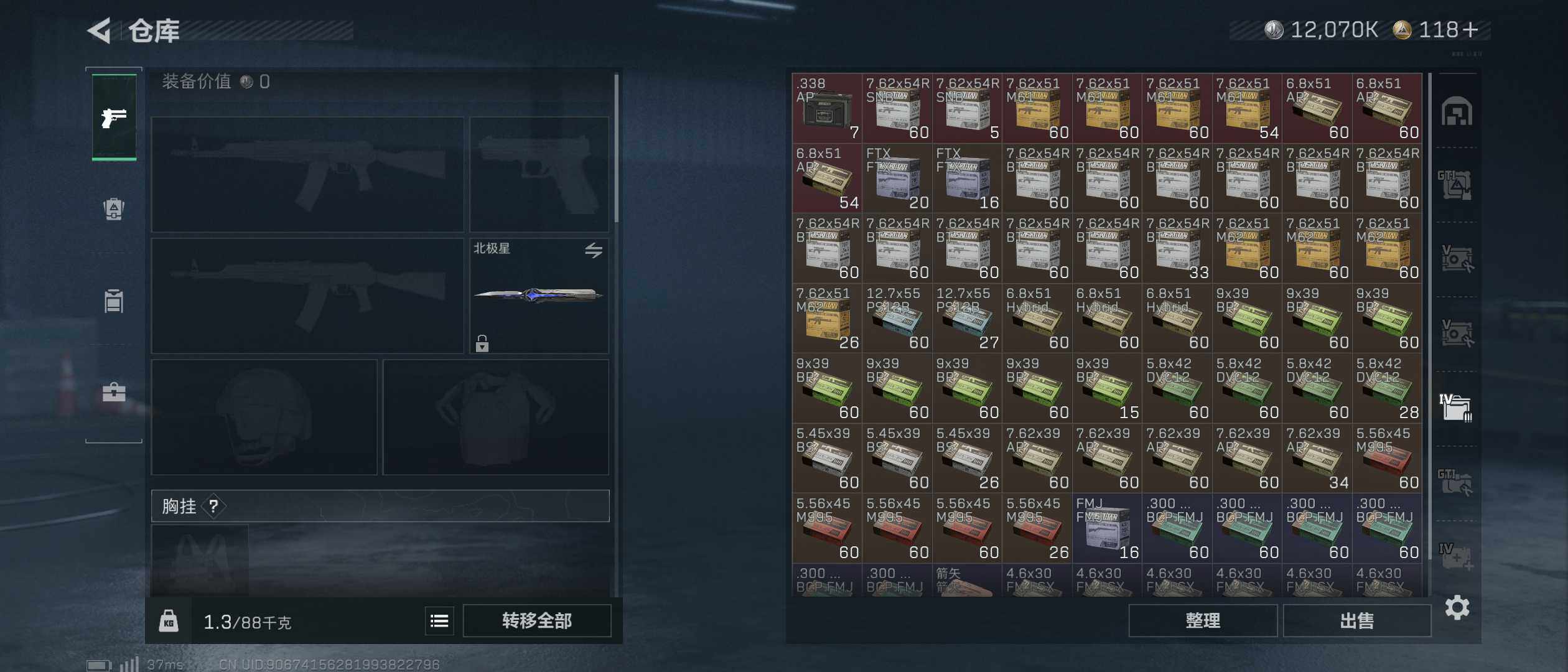 总资产(M):174M/哈夫币(K):12070K 传说枪皮数:20/全面战场等级:32_段位:上等兵/烽火地带等级:60_段位:黄金