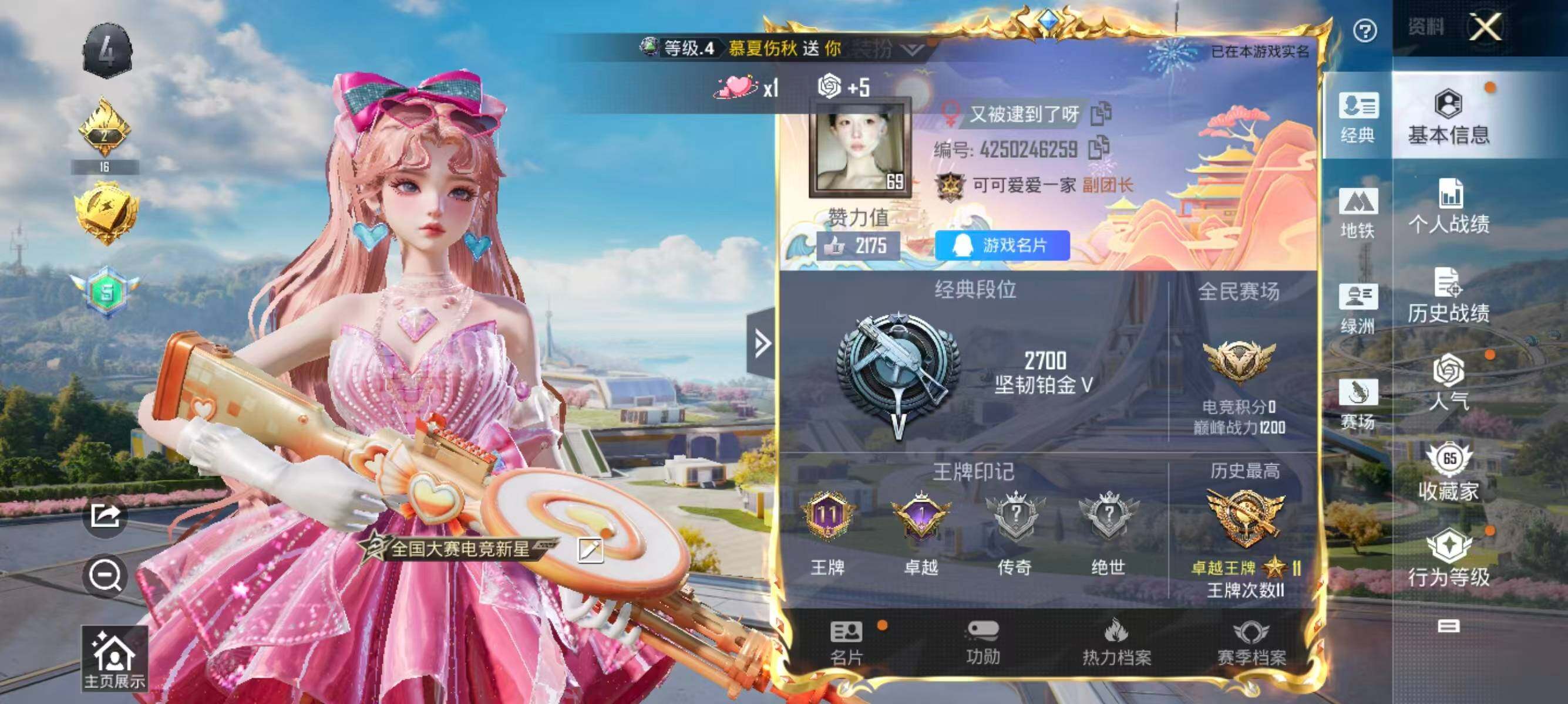 184套装/枪械5/装备280/战备185/王牌印记11/热力值66897/