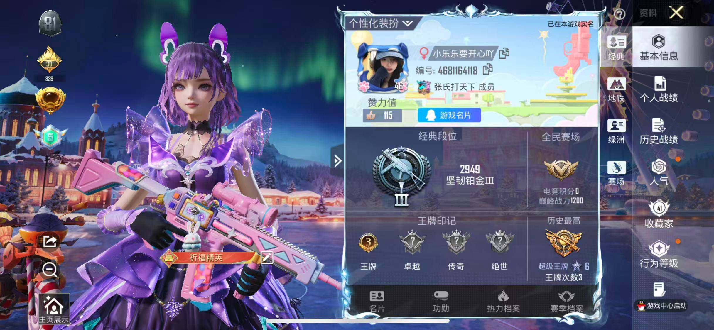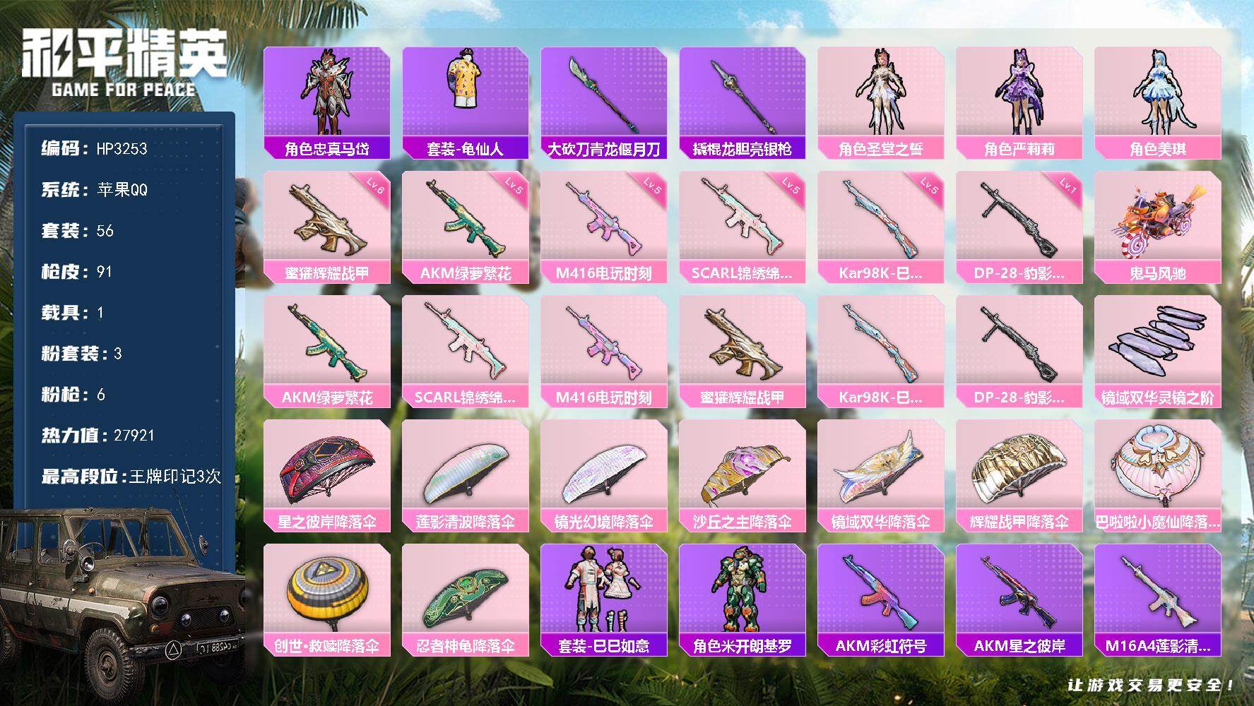 【HP3253】56套装/枪械6/装备116/载具1/战备64/王牌印记3/热力值27921/五级AKM-绿萝繁花/五级SCAR-L-锦绣绵绵/五级M416-电玩时刻/六级蜜獾-辉耀战甲/五级Kar98K-巳巳如意/一级DP-28-豹影疾电/角色-忠真马岱/套装-龟仙人/大砍刀-青龙偃月刀/撬棍-龙胆亮银枪/角色-圣堂之誓/角色-严莉莉/角色-美琪/鬼马风驰/AKM-绿萝繁花/SCAR-L-锦绣绵绵/M416-电玩时刻/蜜獾-辉耀战甲/Kar98K-巳巳如意/DP-28-豹影疾电/镜域双华-灵镜