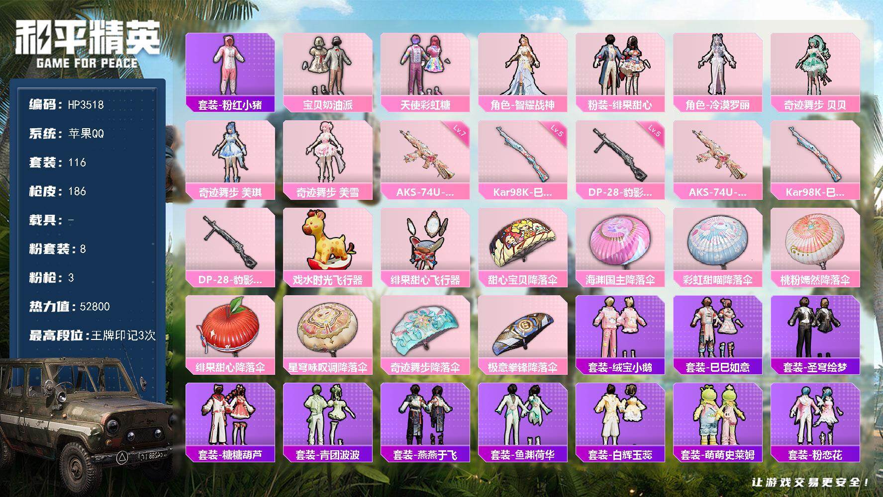 【HP3518】116套装/枪械3/装备223/战备140/王牌印记3/热力值52800/七级AKS-74U-星穹咏叹调/五级Kar98K-巳巳如意/五级DP-28-豹影疾电/套装-粉红小猪/粉装-宝贝奶油派/粉装-天使彩虹糖/角色-智耀战神/粉装-绯果甜心/角色-冷漠罗丽/角色-奇迹舞步 贝贝/角色-奇迹舞步 美琪/角色-奇迹舞步 美雪/AKS-74U-星穹咏叹调/Kar98K-巳巳如意/DP-28-豹影疾电/戏水时光飞行器/绯果甜心飞行器/甜心宝贝降落伞/海渊国主降落伞/彩虹甜喵降落伞/桃粉