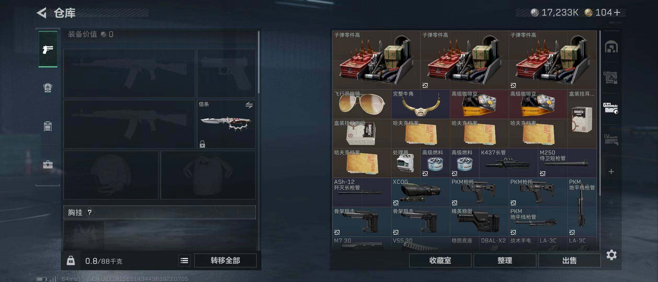 【SJZ81】总资产(M):126M/哈夫币(K):17233K/哈夫币(K):17233K/全面战场等级:16_段位:列兵/烽火地带等级:60_段位:黑鹰/露娜-黑·天际线/威龙-铁面判官/威龙-壮志凌云/蜂医-送葬人·无题密令/牧羊人-街头之王/无名-夜鹰/深蓝-不破誓约/红狼-电锯惊魂/近战-影锋/近战-信条/近战-黑鹰/G18-银灰金属/AK-12突击步枪-阿萨拉卫队/AKM突击步枪-青纹/QBZ95-1突击步枪-花岗岩/Vector冲锋枪-花岗岩/As Val突击步枪-星之彩/PTR-