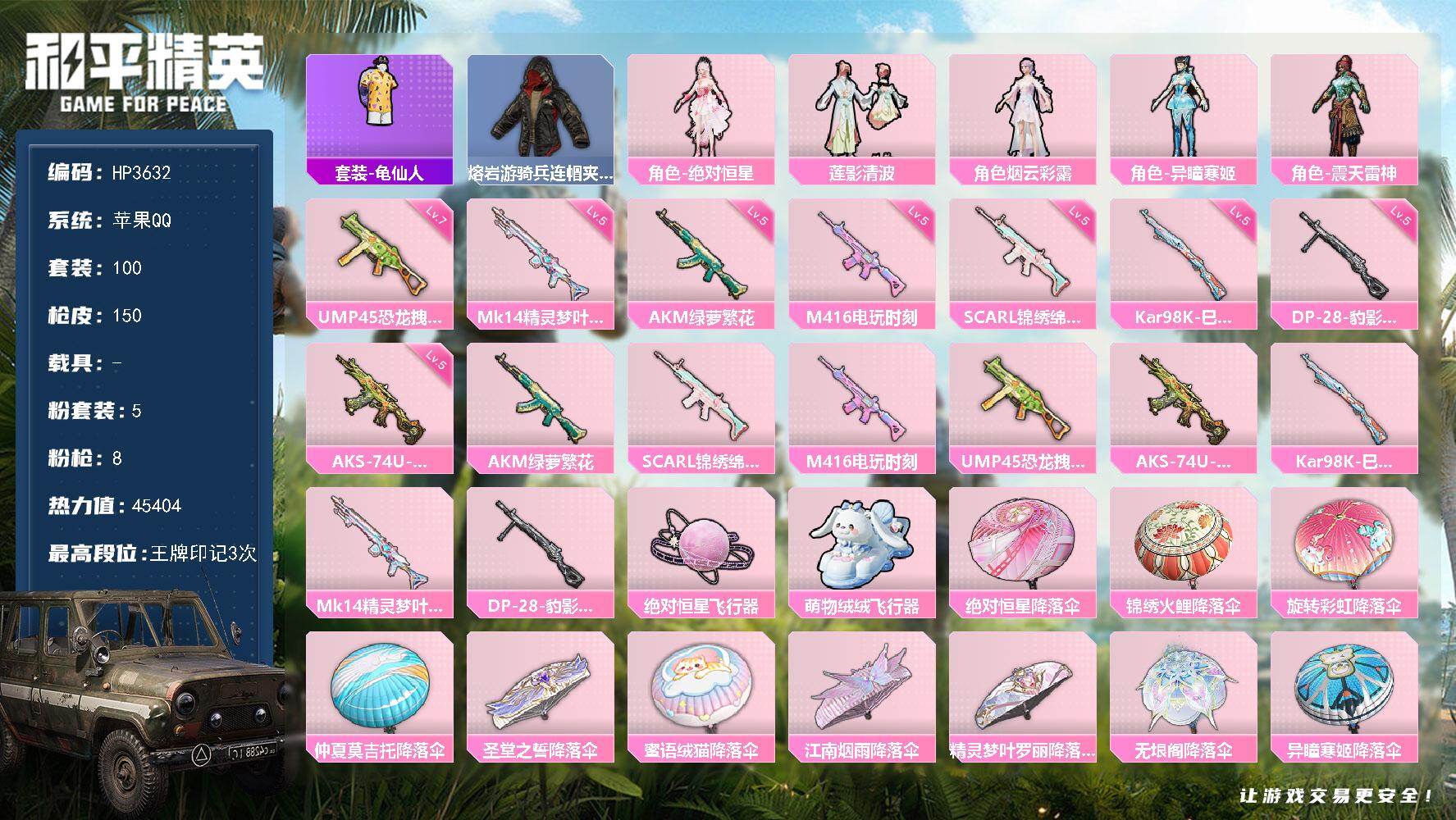 【HP3632】100套装/枪械8/装备187/战备98/王牌印记3/热力值45404/五级AKM-绿萝繁花/五级SCAR-L-锦绣绵绵/五级M416-电玩时刻/七级UMP45-恐龙拽拽/五级AKS-74U-森灵之息/五级Kar98K-巳巳如意/五级Mk14-精灵梦叶罗丽/五级DP-28-豹影疾电/套装-龟仙人/熔岩游骑兵连帽夹克/角色-绝对恒星/粉装-莲影清波/角色-烟云彩露/角色-异瞳寒姬/角色-震天雷神/AKM-绿萝繁花/SCAR-L-锦绣绵绵/M416-电玩时刻/UMP45-恐龙拽拽/A
