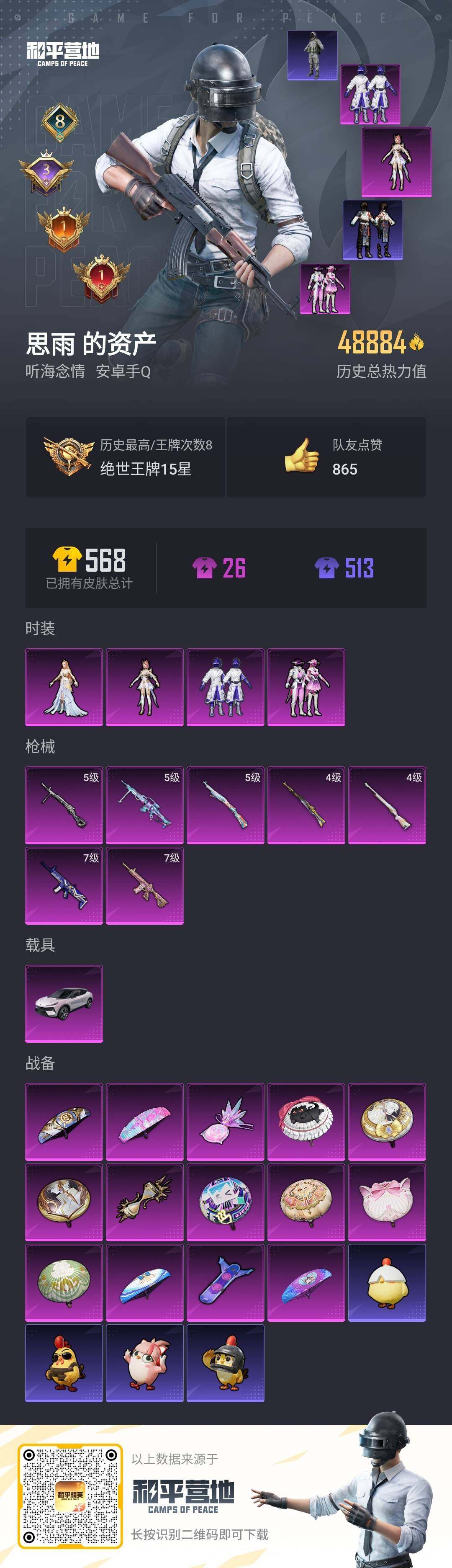99套装/枪械7/装备189/载具1/战备123/王牌印记8/热力值48884/