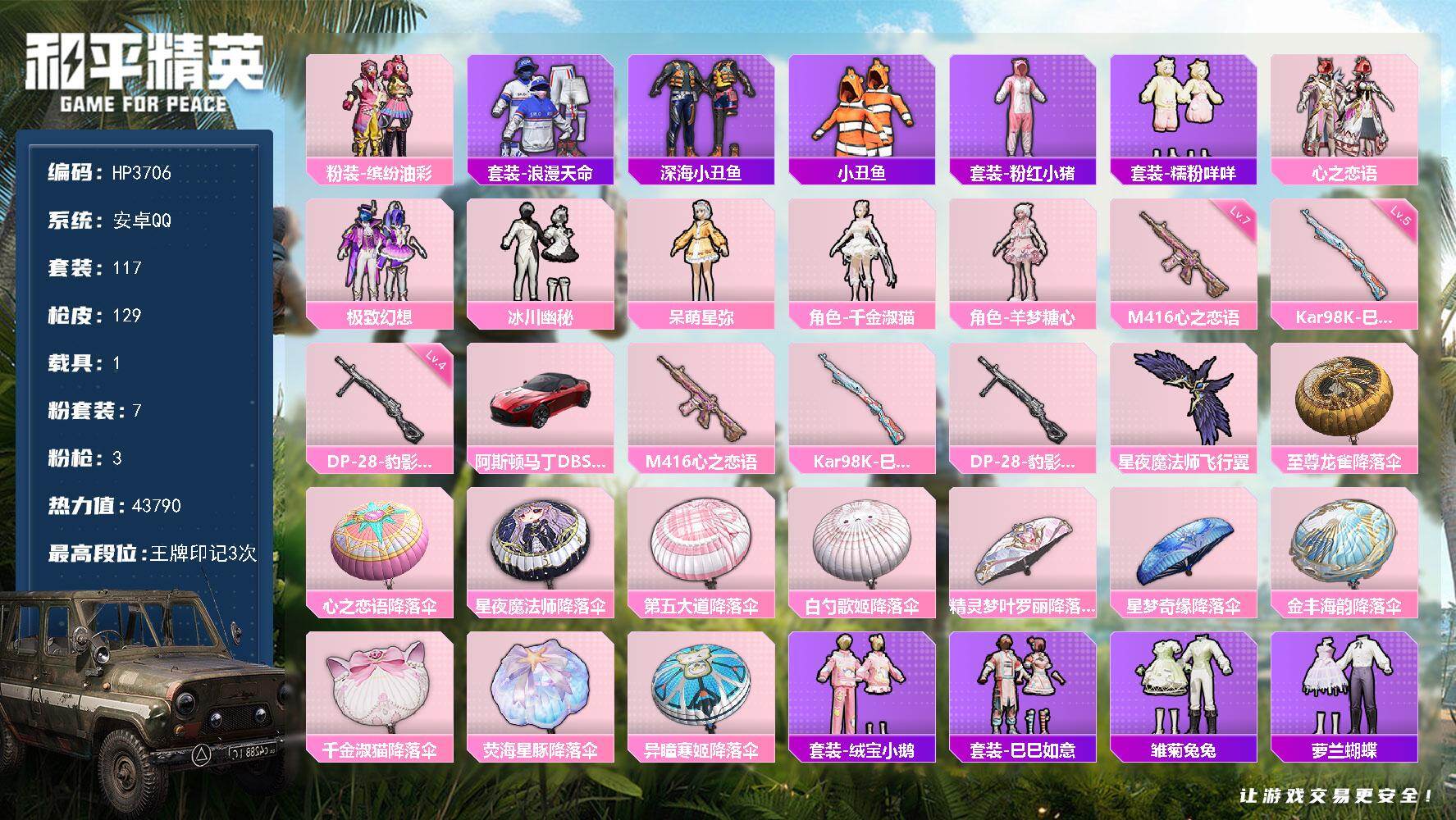 【HP3706】117套装/枪械3/装备169/载具1/战备101/王牌印记3/热力值43790/七级M416-心之恋语/五级Kar98K-巳巳如意/四级DP-28-豹影疾电/粉装-缤纷油彩/套装-浪漫天命/套装-深海小丑鱼/套装-小丑鱼/套装-粉红小猪/套装-糯粉咩咩/粉装-心之恋语/粉装-极致幻想/粉装-冰川幽秘/角色-呆萌星弥/角色-千金淑猫/角色-羊梦糖心/阿斯顿马丁DBS(红)/M416-心之恋语/Kar98K-巳巳如意/DP-28-豹影疾电/星夜魔法师飞行翼/至尊龙雀降落伞/心之恋语