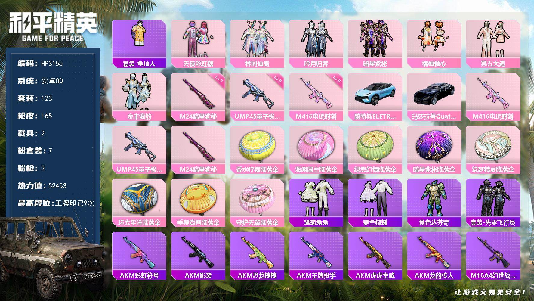 【HP3155】123套装/枪械3/装备209/载具2/战备120/王牌印记9/热力值52453/五级M416-电玩时刻/五级UMP45-量子极限/七级M24-暗星紫秘/套装-龟仙人/粉装-天使彩虹糖/粉装-林间仙鹿/粉装-吟月归客/粉装-暗星紫秘/粉装-橘柚倾心/粉装-第五大道/粉装-金丰海韵/路特斯ELETRE(冰川蓝)/玛莎拉蒂Quattroporte(夜幕蓝)/M416-电玩时刻/UMP45-量子极限/M24-暗星紫秘/香水柠檬降落伞/海渊国主降落伞/绿意幻情降落伞/暗星紫秘降落伞/筑梦