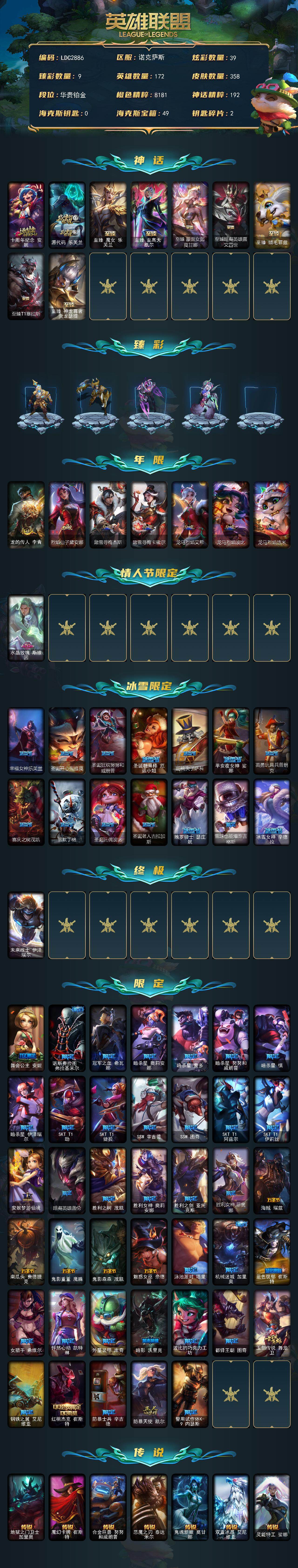 【LDC2886】172英雄/358皮肤/1终极/9神话/63限定/9臻彩/39炫彩/21传说/85史诗/铂金/十周年纪念安妮/源代码乐芙兰/至臻魔女乐芙兰/至臻至高天凯尔/至臻蒙面女郎莫甘娜/至臻暗裔英雄嘉文四世/至臻绒毛菲兹/至臻T1塞拉斯/至臻神龙尊者炎龙瑟提/天龙之子卡莎飞龙乘云/冠军之志瑞兹凯旋圣装/冠军之血希瓦娜凯旋圣装/天煞劫恒星游历者/魔女阿卡丽虚荣/净雪之月莫甘娜冬虹/红莲之刃锐雯/龙的传人李青/烈焰仙子黛安娜/踏雪寻梅杰斯/踏雪寻梅卡蜜尔/龙马烈焰艾希/龙马烈焰波比/龙马烈焰