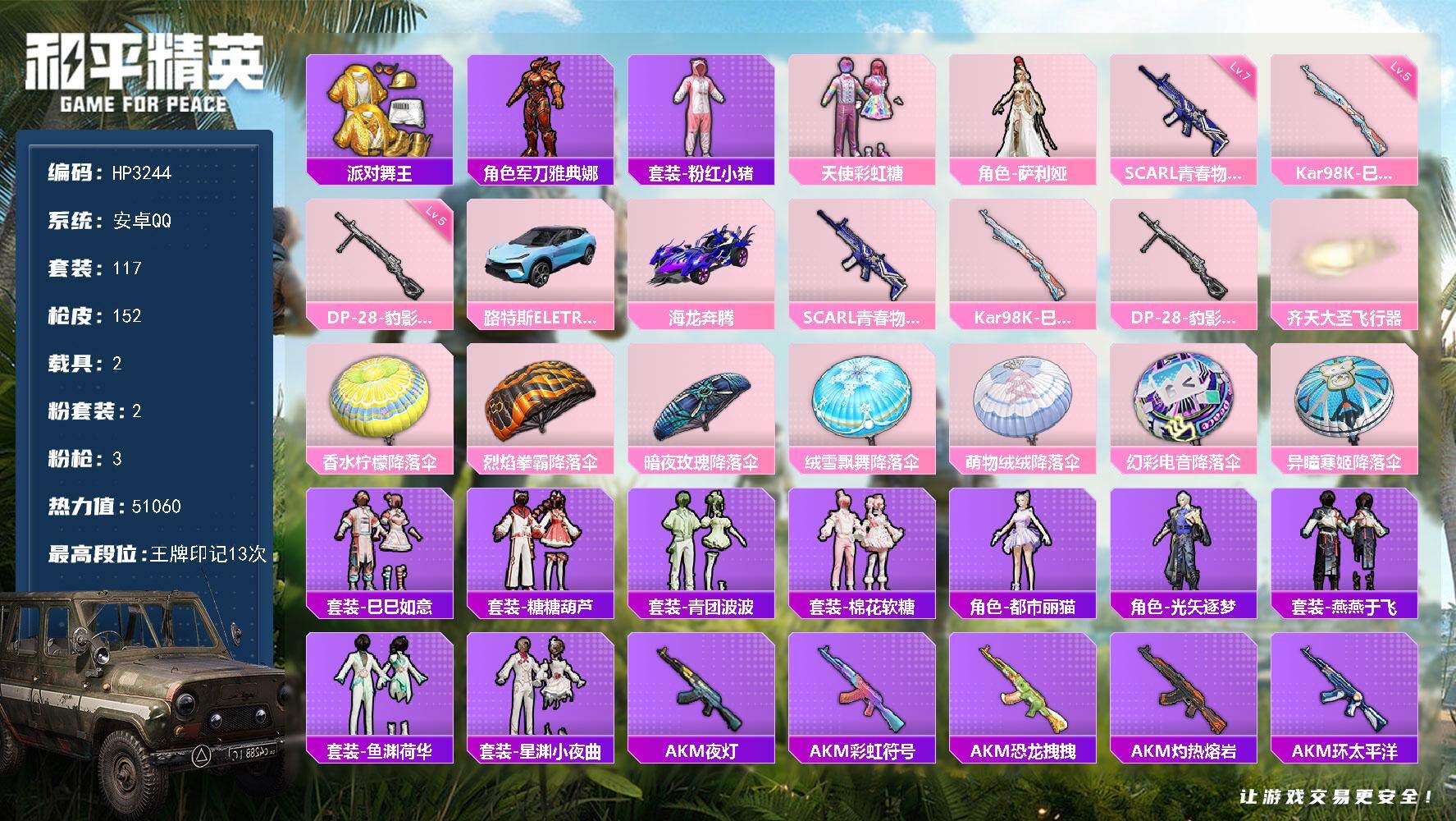 【HP3244】117套装/枪械3/装备180/载具2/战备115/王牌印记13/热力值51060/七级SCAR-L-青春物语/五级Kar98K-巳巳如意/五级DP-28-豹影疾电/套装-派对舞王/角色-军刀雅典娜/套装-粉红小猪/粉装-天使彩虹糖/角色-萨利娅/路特斯ELETRE(冰川蓝)/海龙奔腾/SCAR-L-青春物语/Kar98K-巳巳如意/DP-28-豹影疾电/齐天大圣飞行器/香水柠檬降落伞/烈焰拳霸降落伞/暗夜玫瑰降落伞/绒雪飘舞降落伞/萌物绒绒降落伞/幻彩电音降落伞/异瞳寒姬降落伞
