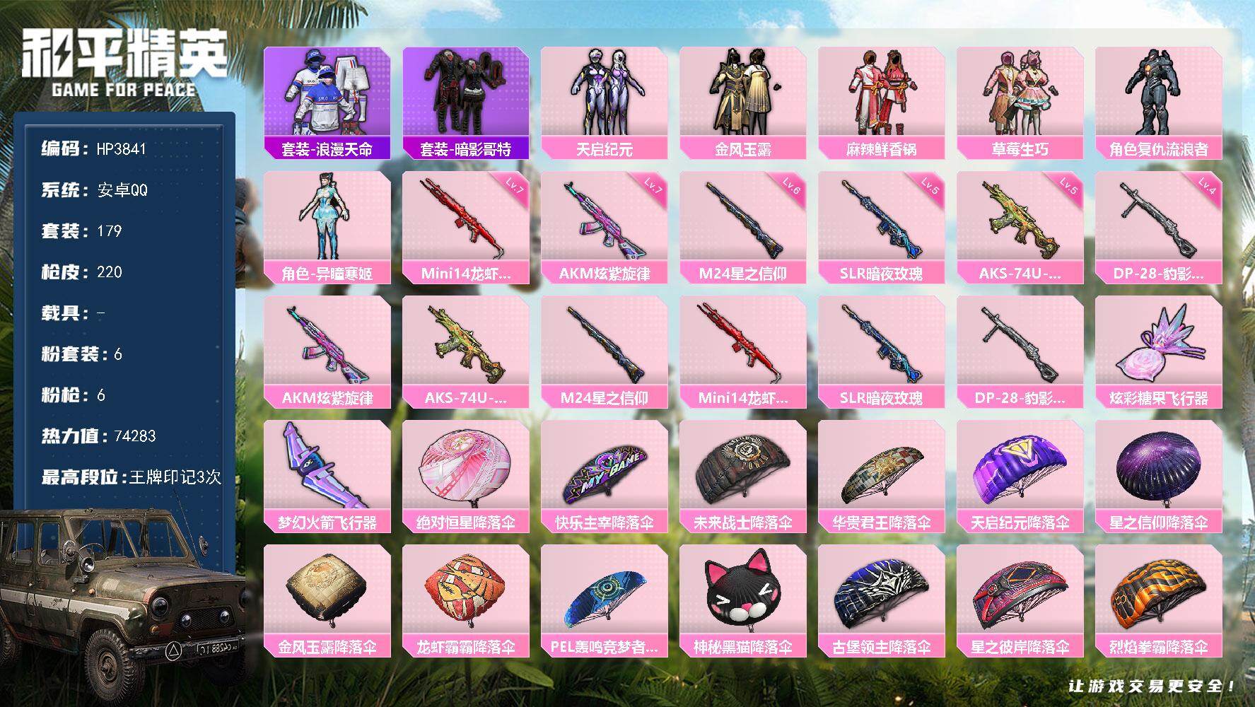 【HP3841】179套装/枪械6/装备271/战备137/王牌印记3/热力值74283/七级AKM-炫紫旋律/五级AKS-74U-森灵之息/六级M24-星之信仰/七级Mini14-龙虾霸霸/五级SLR-暗夜玫瑰/四级DP-28-豹影疾电/套装-浪漫天命/套装-暗影哥特/粉装-天启纪元/粉装-金风玉露/粉装-麻辣鲜香锅/粉装-草莓生巧/角色-复仇流浪者/角色-异瞳寒姬/AKM-炫紫旋律/AKS-74U-森灵之息/M24-星之信仰/Mini14-龙虾霸霸/SLR-暗夜玫瑰/DP-28-豹影疾电/炫