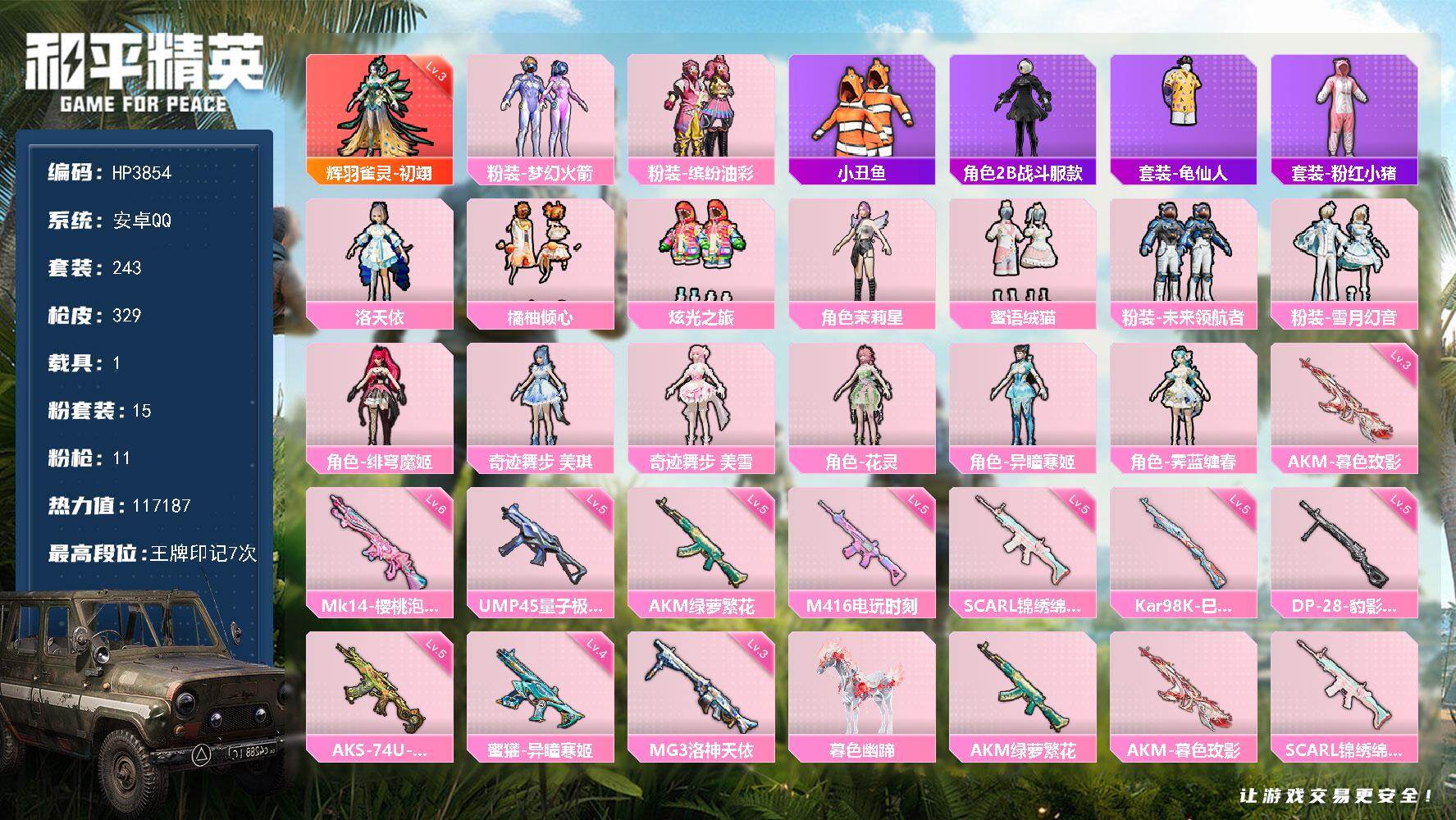 【HP3854】243套装/枪械11/装备493/载具1/战备301/王牌印记7/热力值117187/五级AKM-绿萝繁花/三级AKM-暮色玫影/五级SCAR-L-锦绣绵绵/五级M416-电玩时刻/四级蜜獾-异瞳寒姬/五级UMP45-量子极限/五级AKS-74U-森灵之息/五级Kar98K-巳巳如意/六级Mk14-樱桃泡泡/五级DP-28-豹影疾电/三级MG3-洛神天依/三级辉羽雀灵-初翊/辉羽雀灵-初翊/粉装-梦幻火箭/粉装-缤纷油彩/套装-小丑鱼/角色-2B战斗服款/套装-龟仙人/套装-粉红
