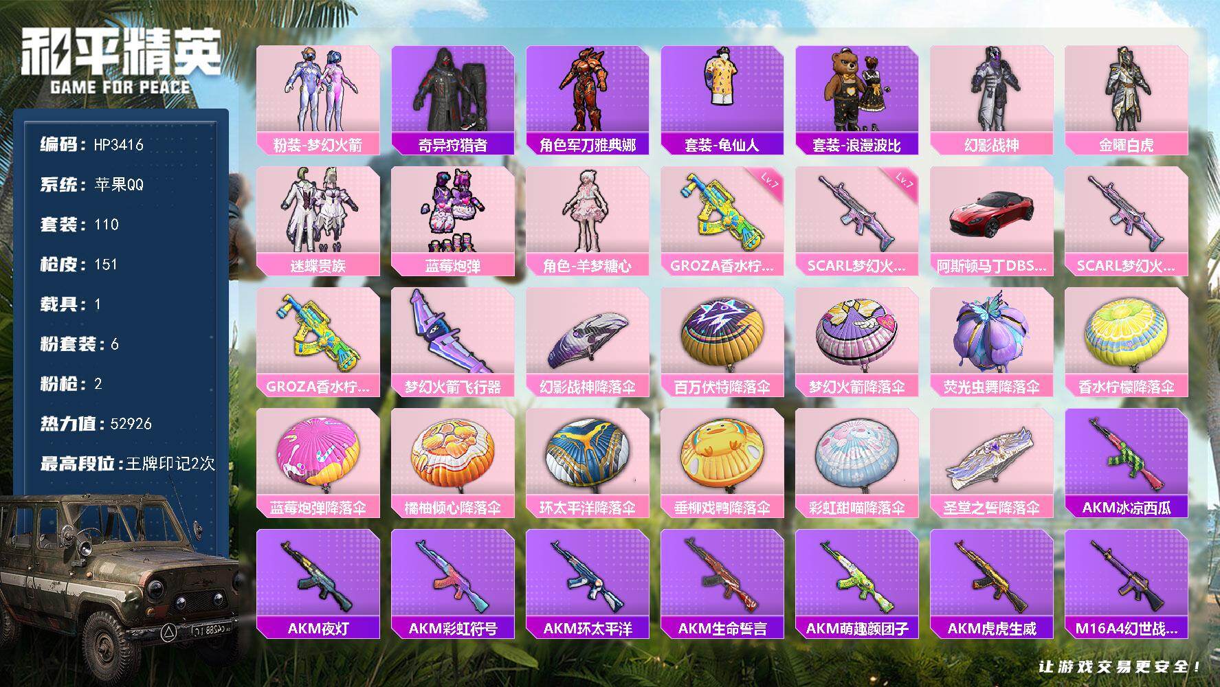 【HP3416】110套装/枪械2/装备183/载具1/战备105/王牌印记2/热力值52926/七级SCAR-L-梦幻火箭/七级GROZA-香水柠檬/粉装-梦幻火箭/套装-奇异狩猎者/角色-军刀雅典娜/套装-龟仙人/套装-浪漫波比/粉装-幻影战神/粉装-金曜白虎/粉装-迷蝶贵族/粉装-蓝莓炮弹/角色-羊梦糖心/阿斯顿马丁DBS(红)/SCAR-L-梦幻火箭/GROZA-香水柠檬/梦幻火箭飞行器/幻影战神降落伞/百万伏特降落伞/梦幻火箭降落伞/荧光虫舞降落伞/香水柠檬降落伞/蓝莓炮弹降落伞/橘柚