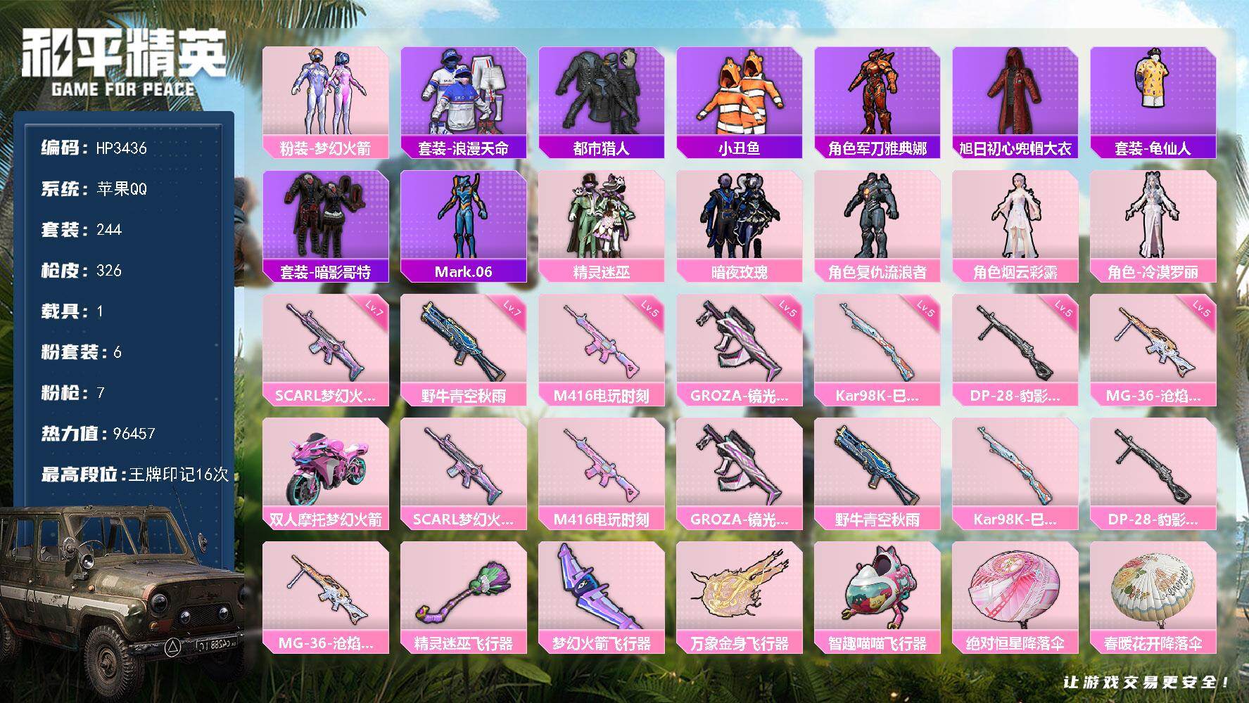 【HP3436】244套装/枪械7/装备409/载具1/战备227/王牌印记16/热力值96457/七级SCAR-L-梦幻火箭/五级M416-电玩时刻/五级GROZA-镜光银凌/七级野牛-青空秋雨/五级Kar98K-巳巳如意/五级DP-28-豹影疾电/五级MG-36-沧焰双生/粉装-梦幻火箭/套装-浪漫天命/套装-都市猎人/套装-小丑鱼/角色-军刀雅典娜/旭日初心兜帽大衣/套装-龟仙人/套装-暗影哥特/角色-Mark.06/粉装-精灵迷巫/粉装-暗夜玫瑰/角色-复仇流浪者/角色-烟云彩露/角色-
