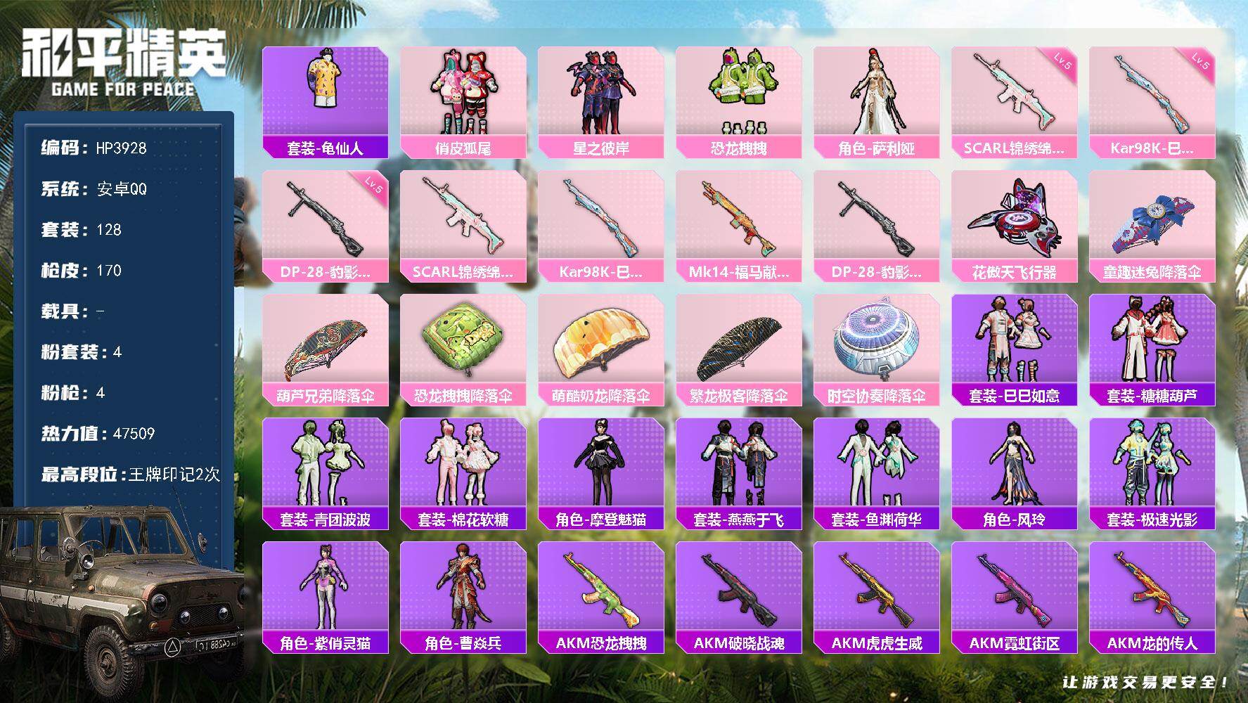 【HP3928】128套装/枪械4/装备195/战备97/王牌印记2/热力值47509/五级SCAR-L-锦绣绵绵/五级Kar98K-巳巳如意/五级DP-28-豹影疾电/套装-龟仙人/粉装-俏皮狐尾/粉装-星之彼岸/粉装-恐龙拽拽/角色-萨利娅/SCAR-L-锦绣绵绵/Kar98K-巳巳如意/Mk14-福马献瑞/DP-28-豹影疾电/花傲天飞行器/童趣迷兔降落伞/葫芦兄弟降落伞/恐龙拽拽降落伞/萌酷奶龙降落伞/繁龙极客降落伞/时空协奏降落伞/套装-巳巳如意/套装-糖糖葫芦/套装-青团波波/套装-